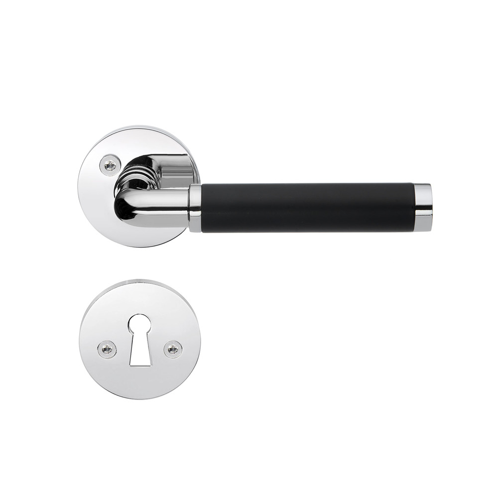 Ge ditt hem en ny look genom att byta innerdörrshandtagen. Detta moderna handtag har en yta av polerad krom och ett grepp av svart bakelit. Perfekt för husets alla rum. Komplett med nyckelskyltar.