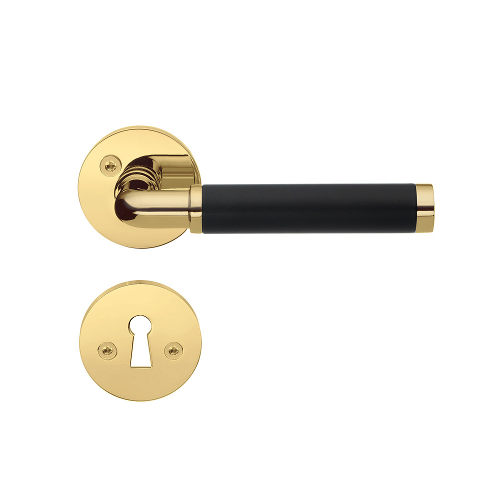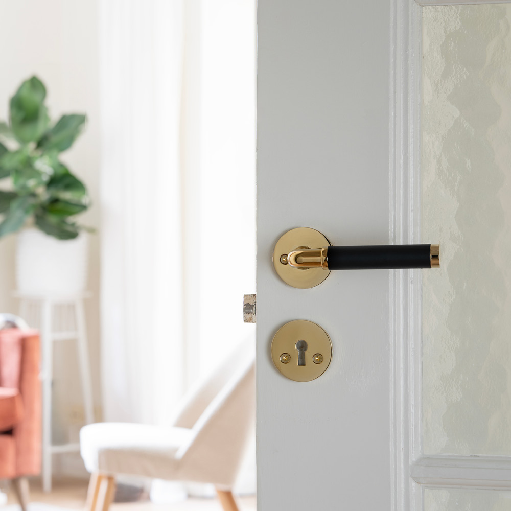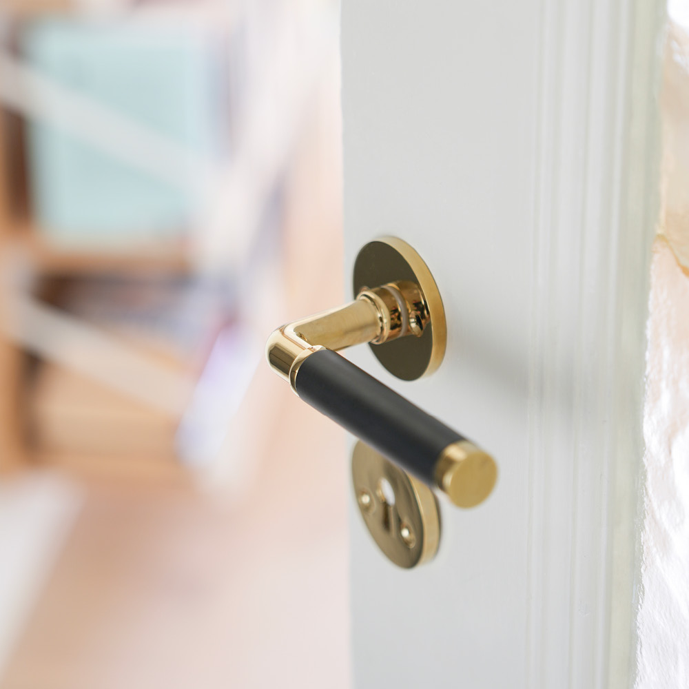 Ge ditt hem en ny look genom att byta innerdörrshandtagen. Detta moderna handtag har en yta av polerad mässing och ett grepp av svart bakelit. Perfekt för husets alla rum. Komplett med nyckelskyltar.