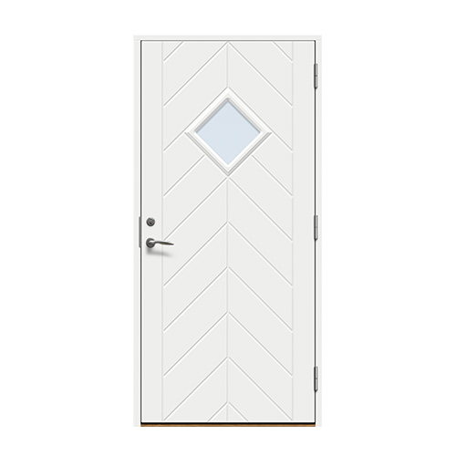 Alesta är en vitmålad dörr med ett stilrent fönster för ljusinsläpp.