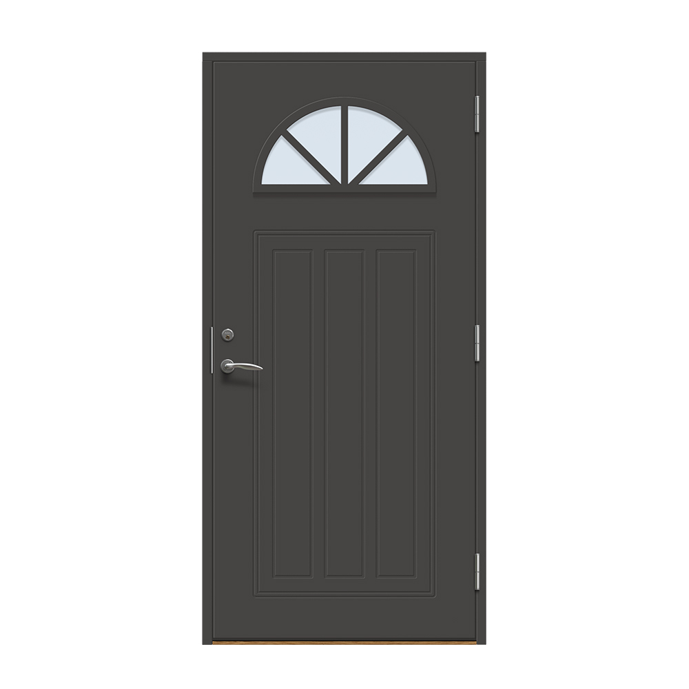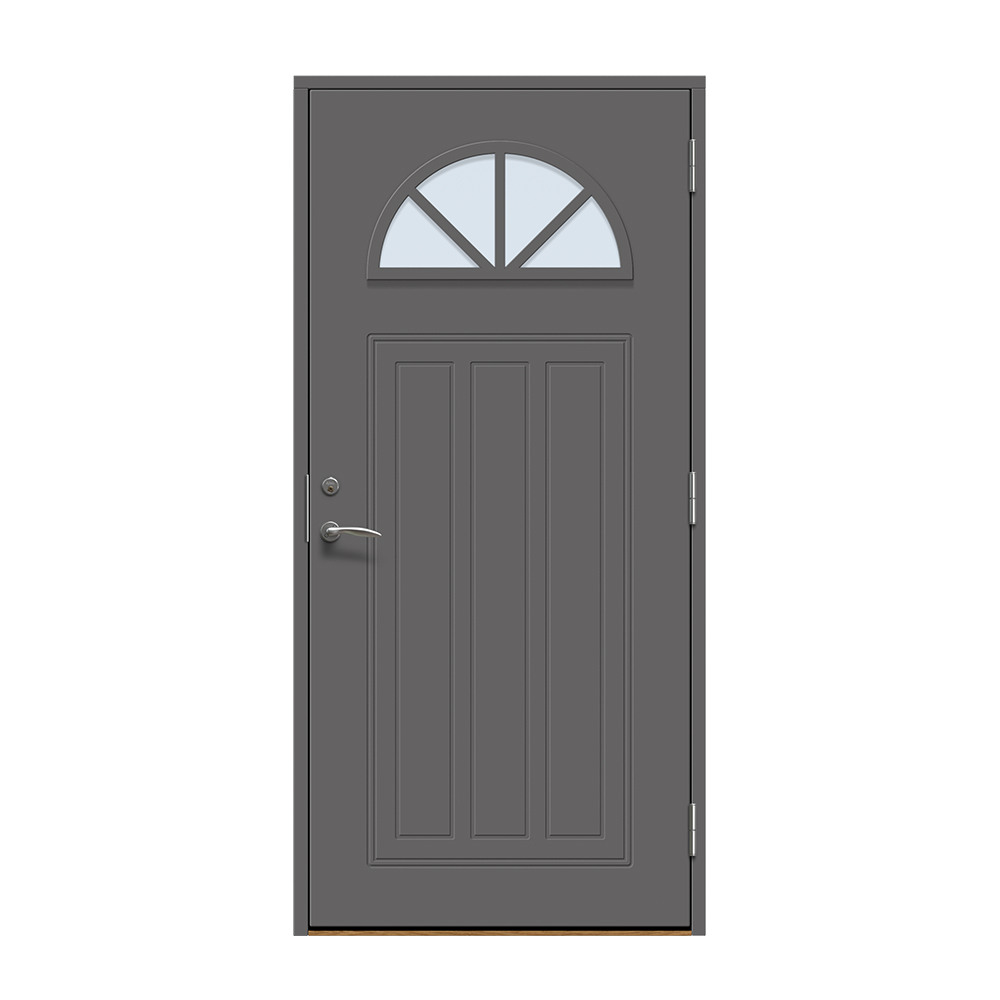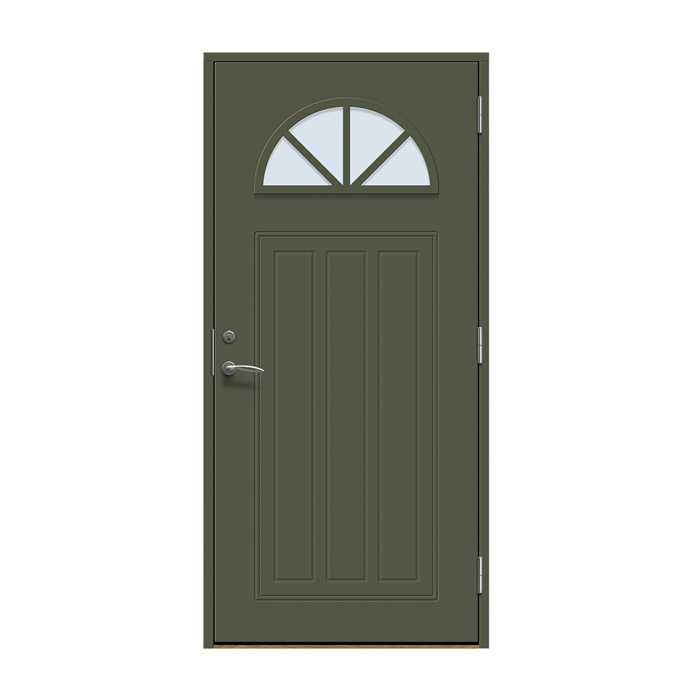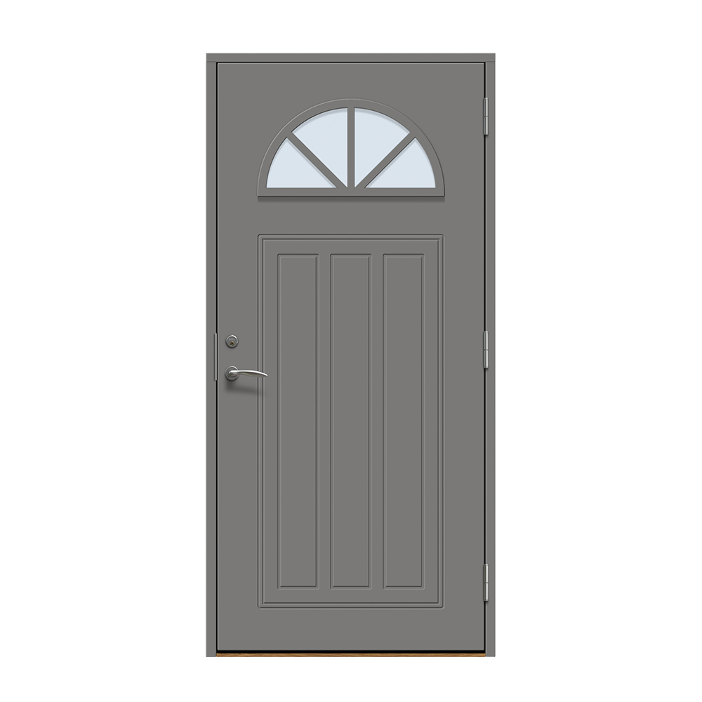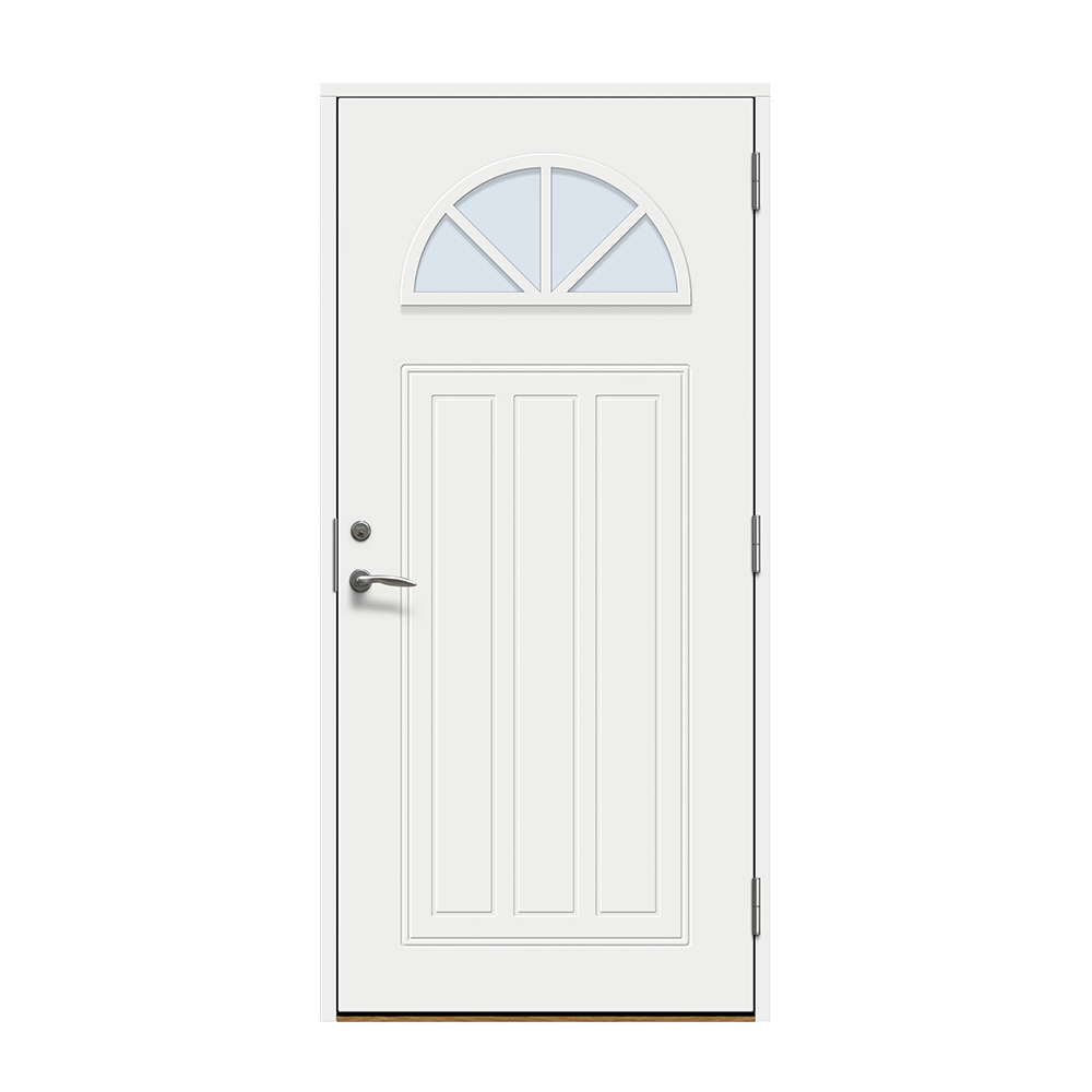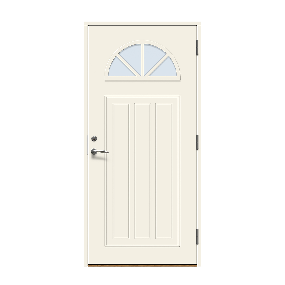 Allerum är en entrédörr med ett lantligt halvmåneformat fönster. Spårfräst utsida i ett klassiskt mönster och en slät insida.