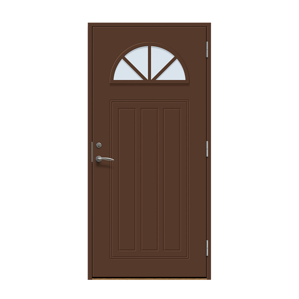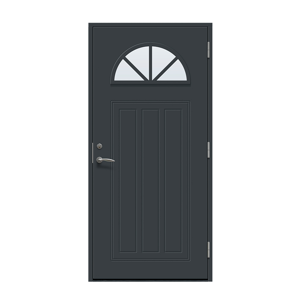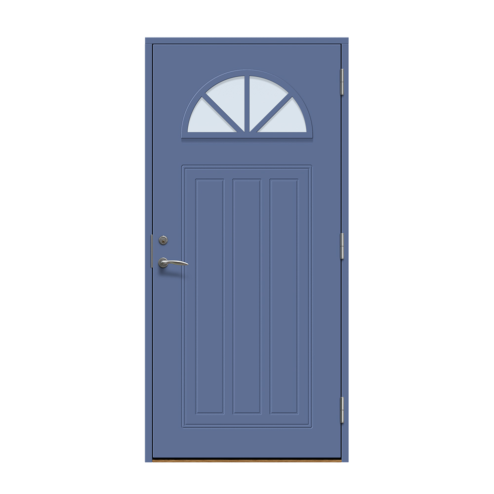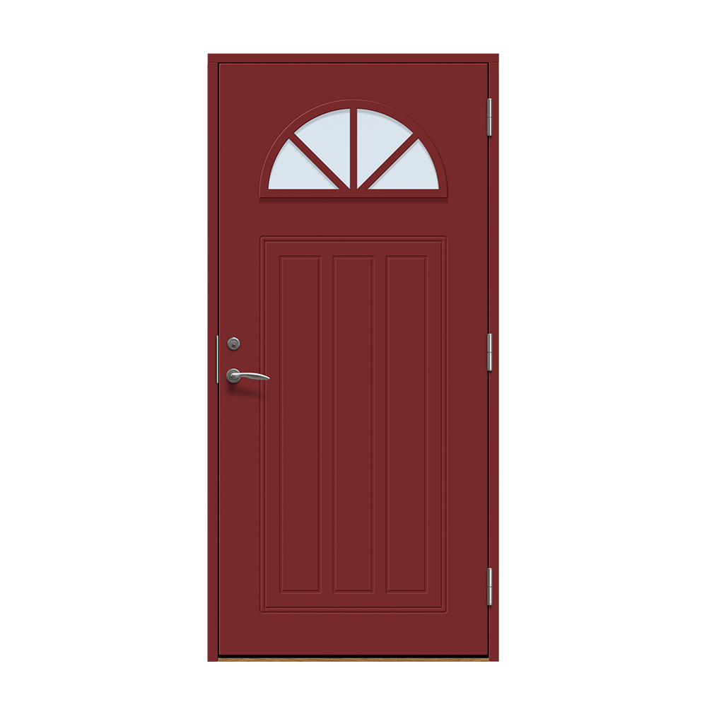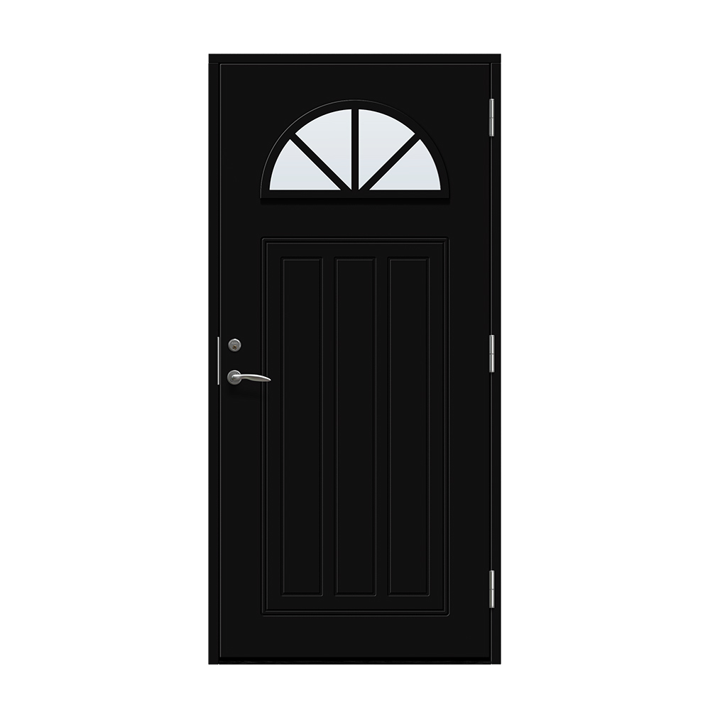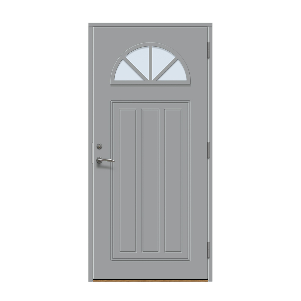 Allerum är en entrédörr med ett lantligt halvmåneformat fönster. Spårfräst utsida i ett klassiskt mönster och en slät insida.