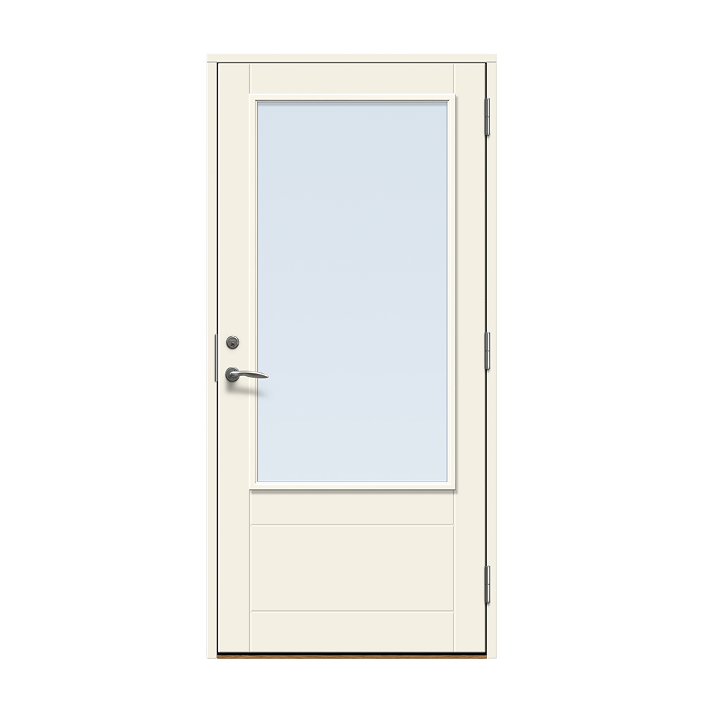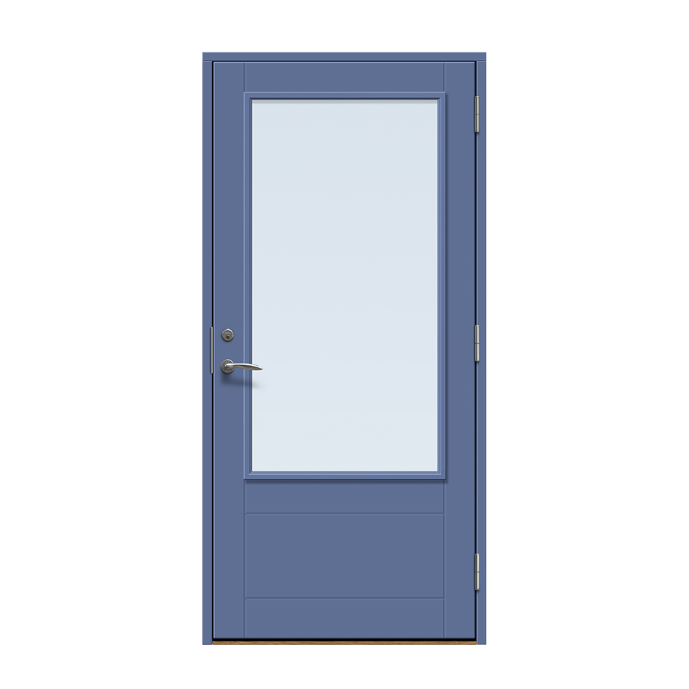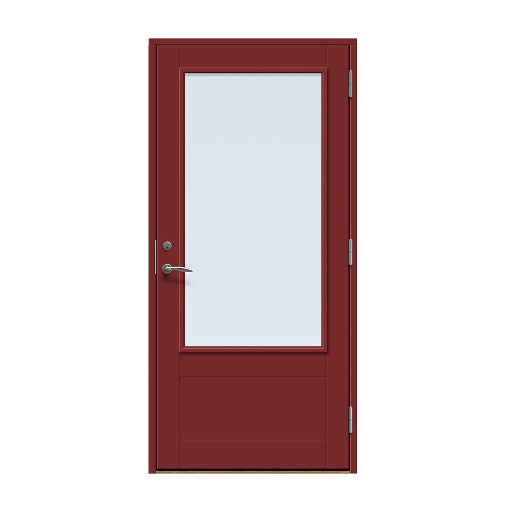 Dörren färgläggs med en vattenbaserad målningsteknik. Vi rekommenderar inte ommålning av ytterdörren eftersom glaslist och dörr är i olika material och kan reagera olika på den färg som används. Observera att en ytterdörr i mörk kulör ska monteras skyddad från direkt starkt solljus och hög värme för att undvika skevhet och solblekning.