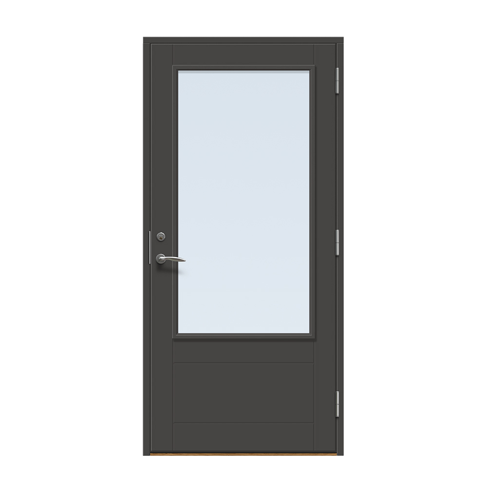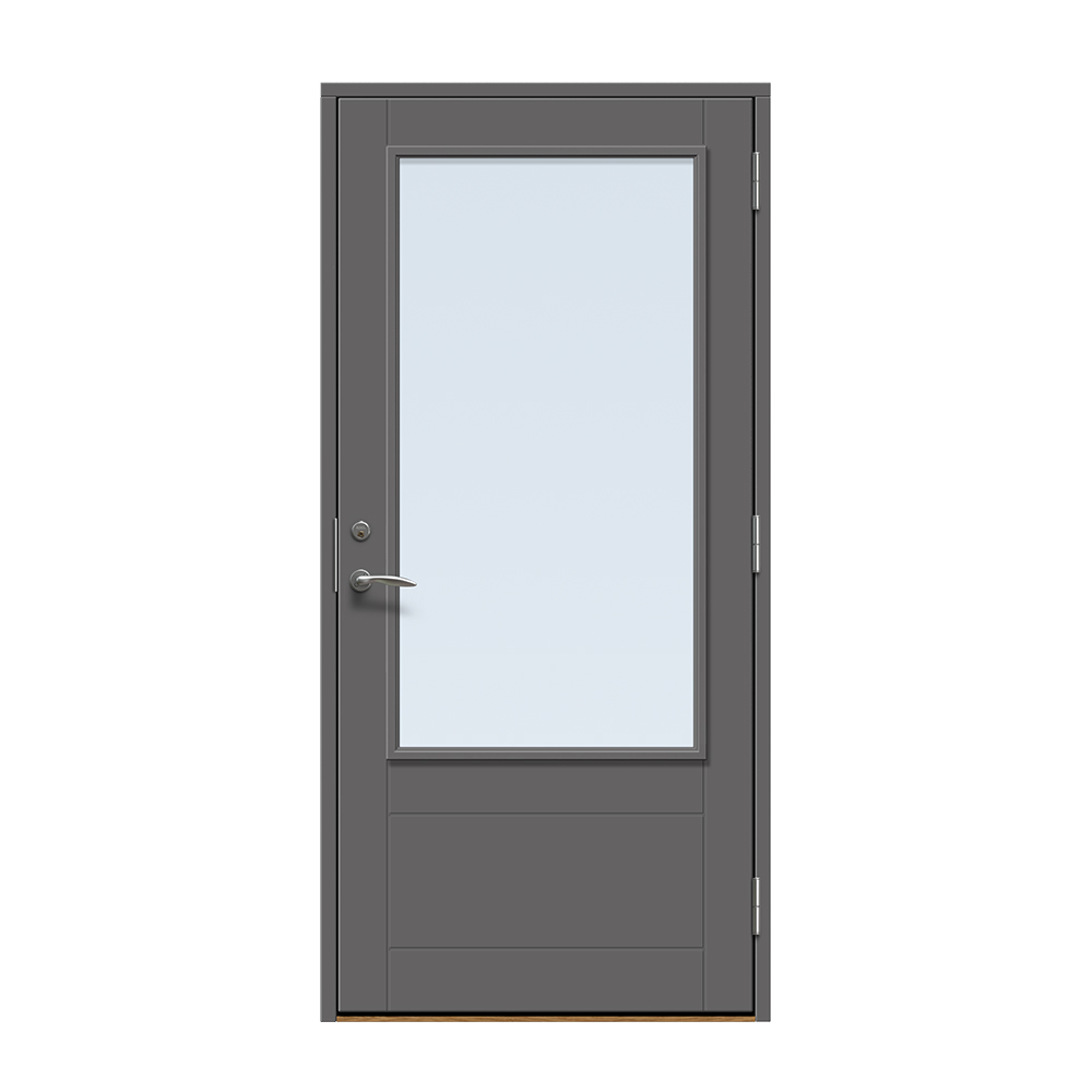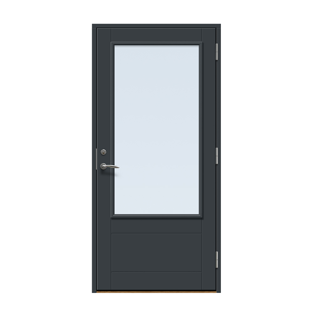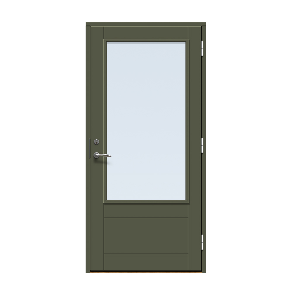 Dörren färgläggs med en vattenbaserad målningsteknik. Vi rekommenderar inte ommålning av ytterdörren eftersom glaslist och dörr är i olika material och kan reagera olika på den färg som används. Observera att en ytterdörr i mörk kulör ska monteras skyddad från direkt starkt solljus och hög värme för att undvika skevhet och solblekning.