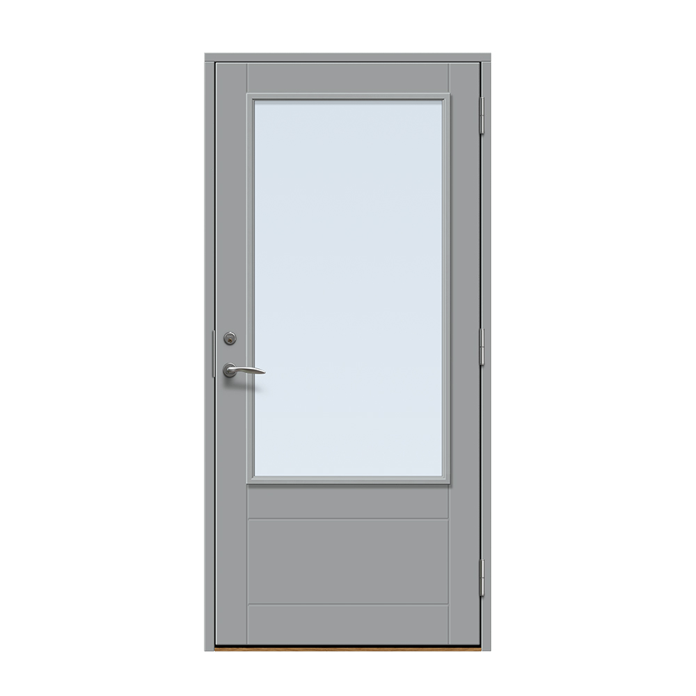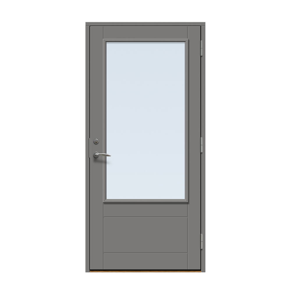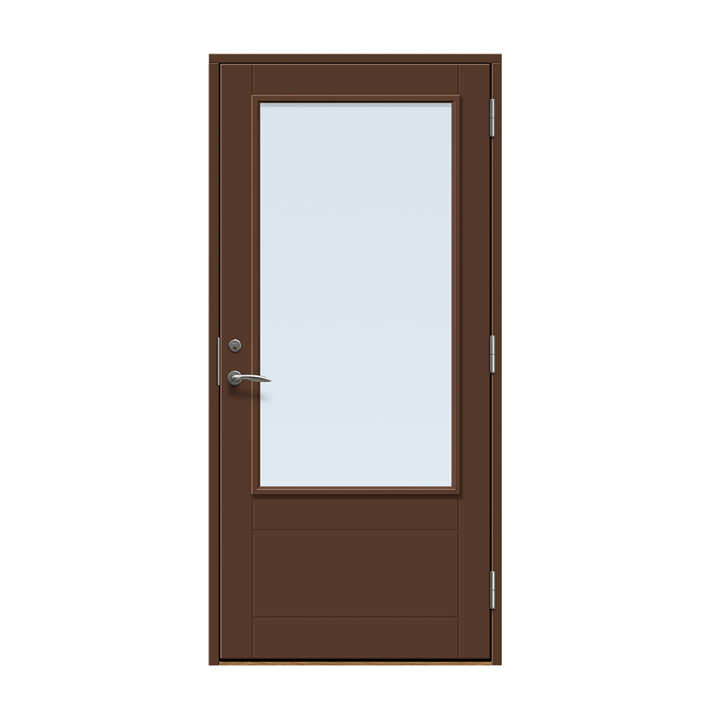 Dörren är täckt av en tålig faner. Behandlingen som appliceras på dörrens träfibrer gör att dörren tål extrema mängder vatten med minimal rörelse och svullnad. Dörren blir mycket tålig och färgen fäster bättre vilket ger längre underhållsintervall. Om dörren har fönster kommer glaset vara laminerat för extra styrka.