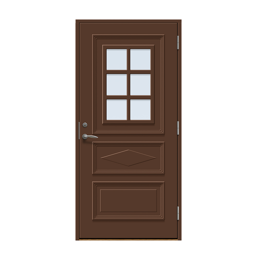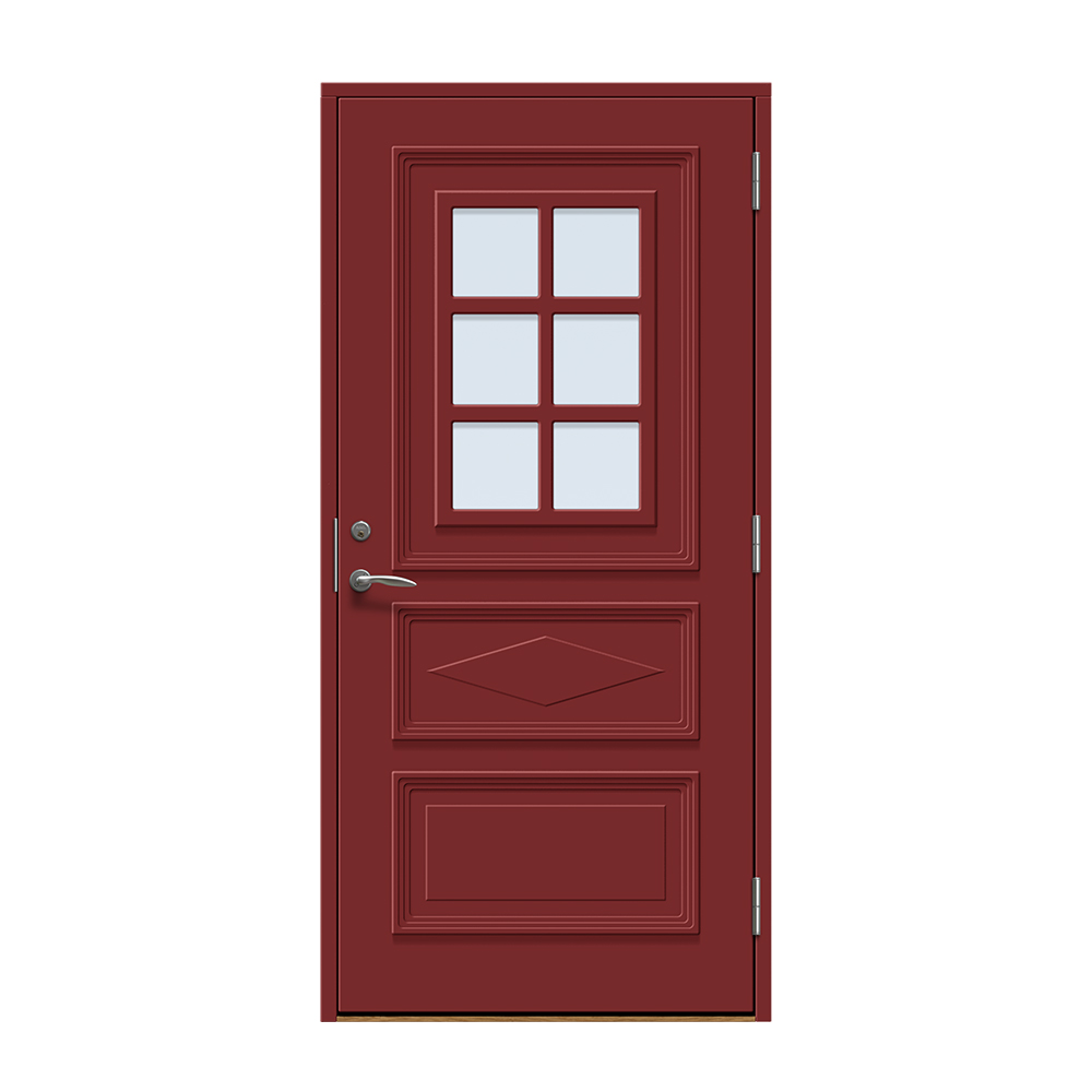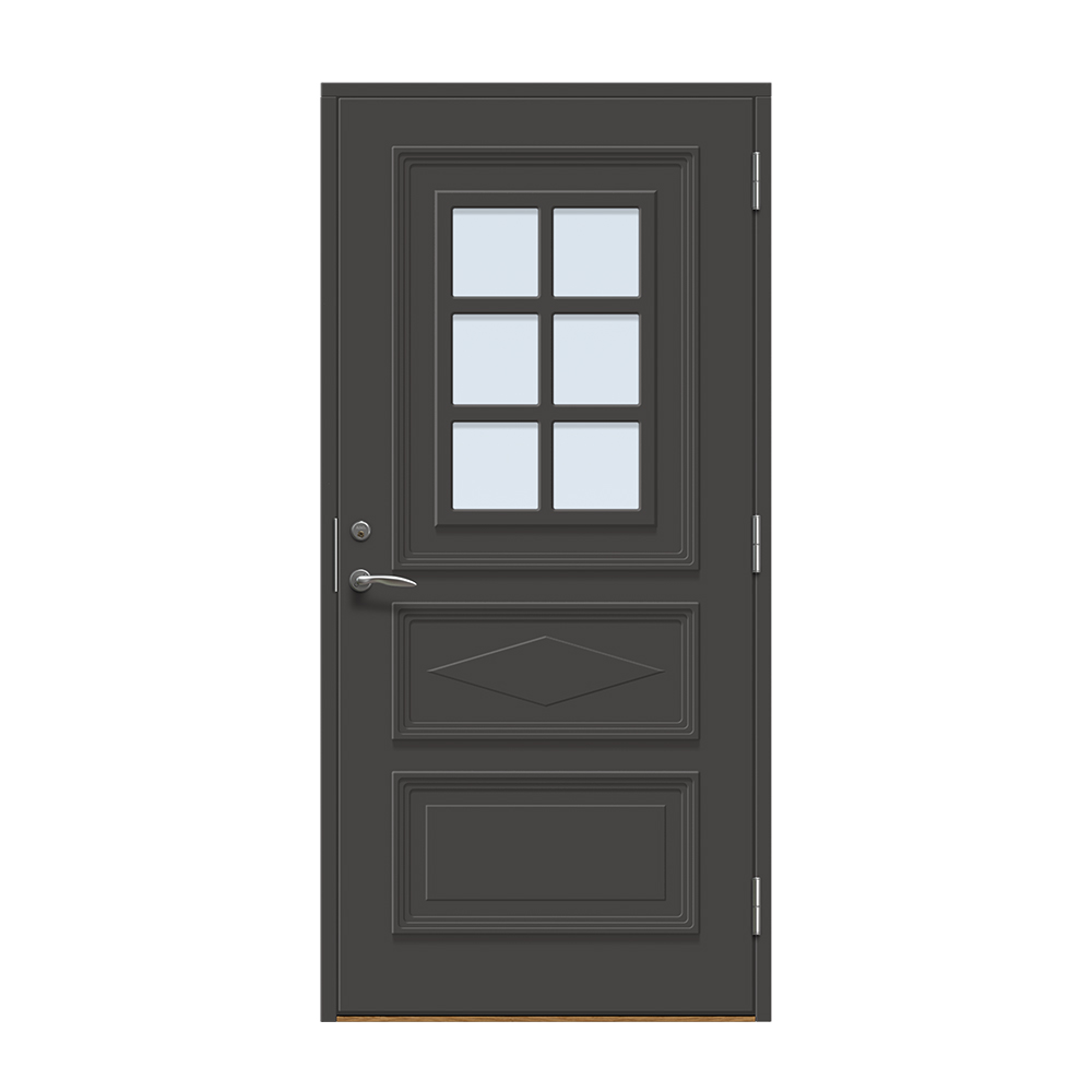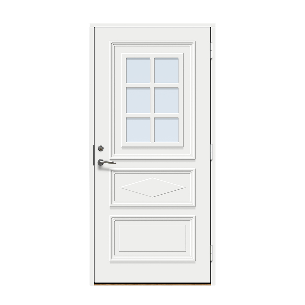 Dörren är täckt av en tålig faner. Behandlingen som appliceras på dörrens träfibrer gör att dörren tål extrema mängder vatten med minimal rörelse och svullnad. Dörren blir mycket tålig och färgen fäster bättre vilket ger längre underhållsintervall. Om dörren har fönster kommer glaset vara laminerat för extra styrka.