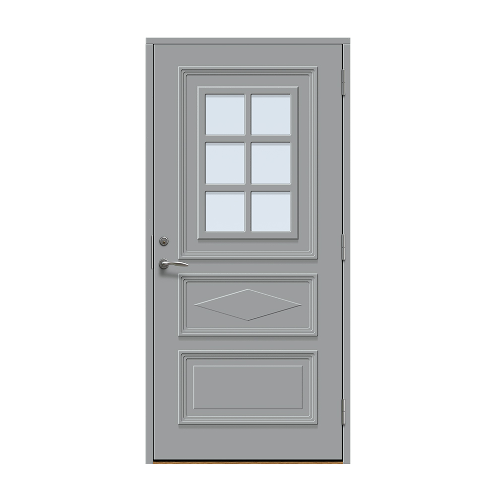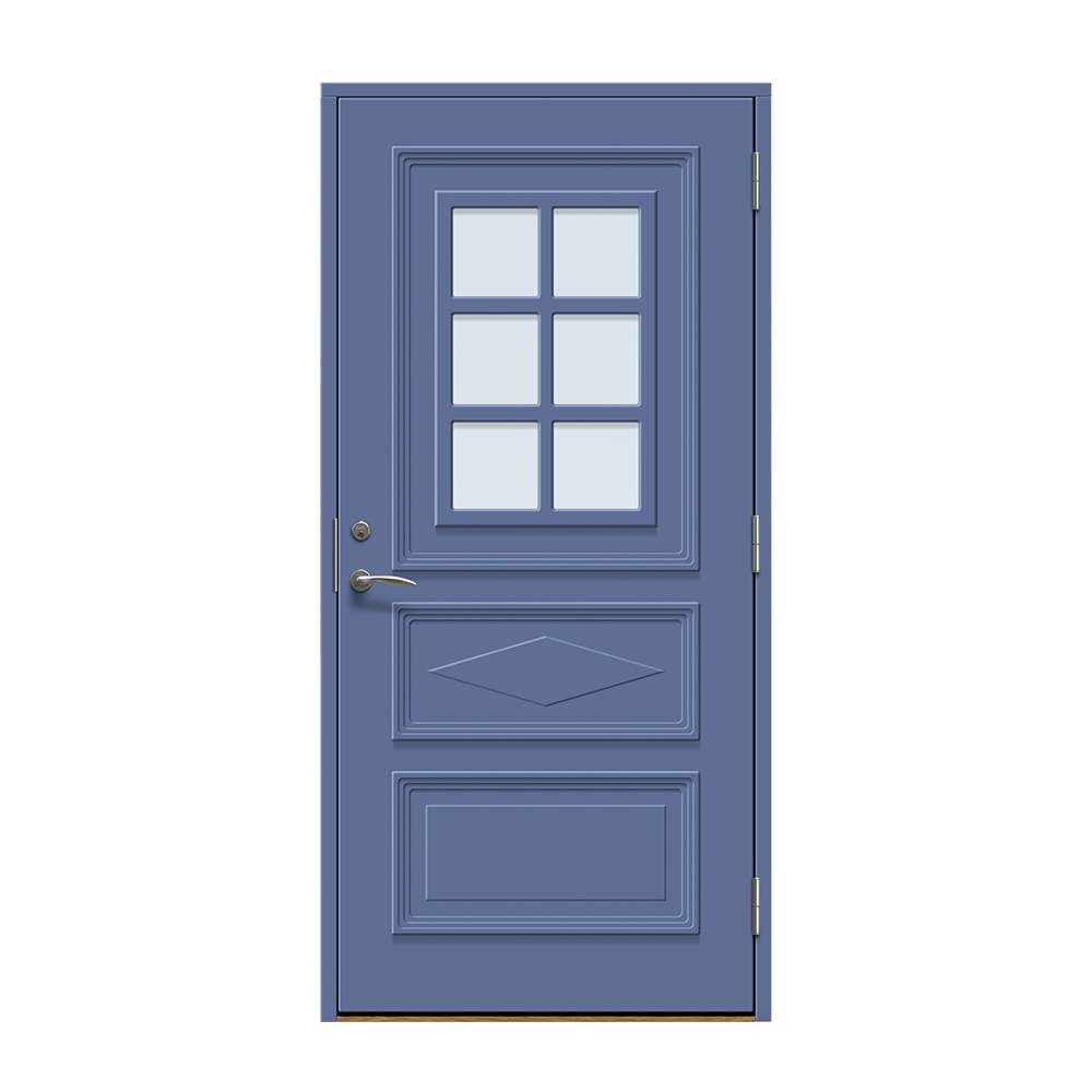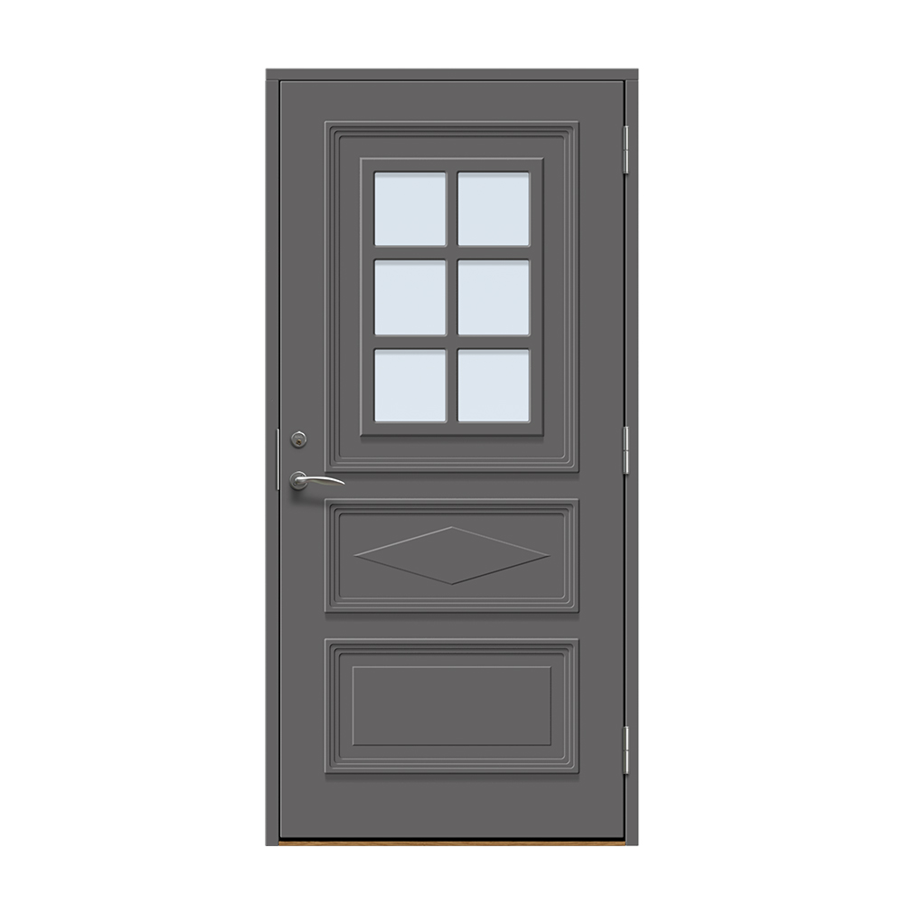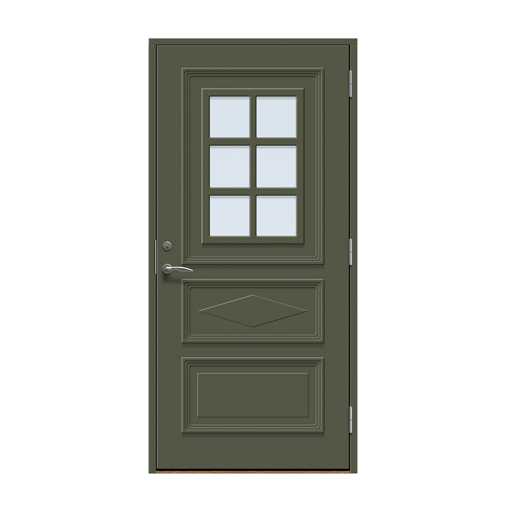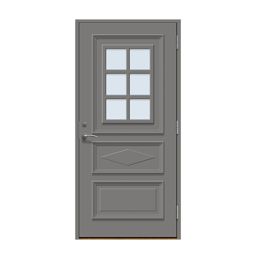 Dörren är täckt av en tålig faner. Behandlingen som appliceras på dörrens träfibrer gör att dörren tål extrema mängder vatten med minimal rörelse och svullnad. Dörren blir mycket tålig och färgen fäster bättre vilket ger längre underhållsintervall. Om dörren har fönster kommer glaset vara laminerat för extra styrka.