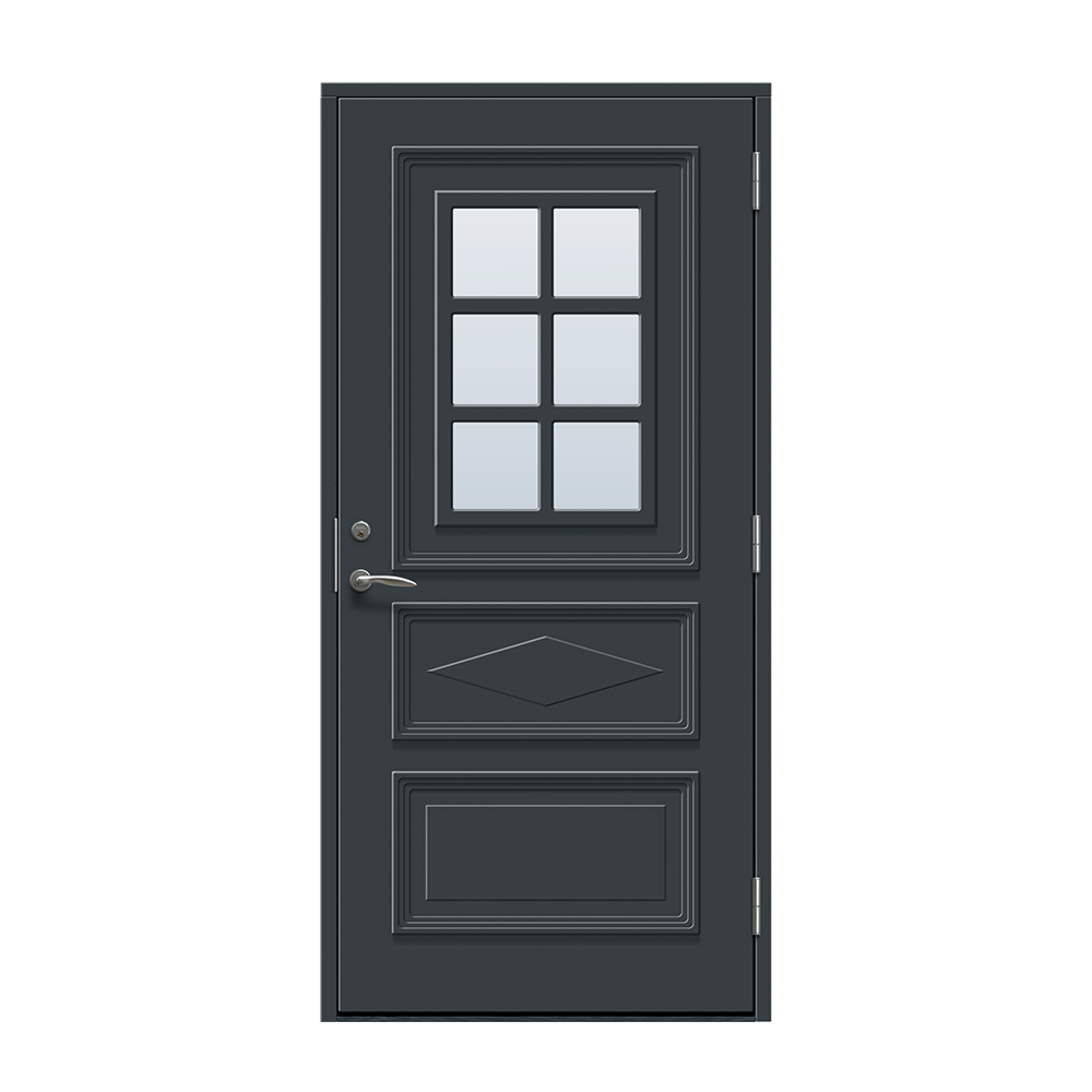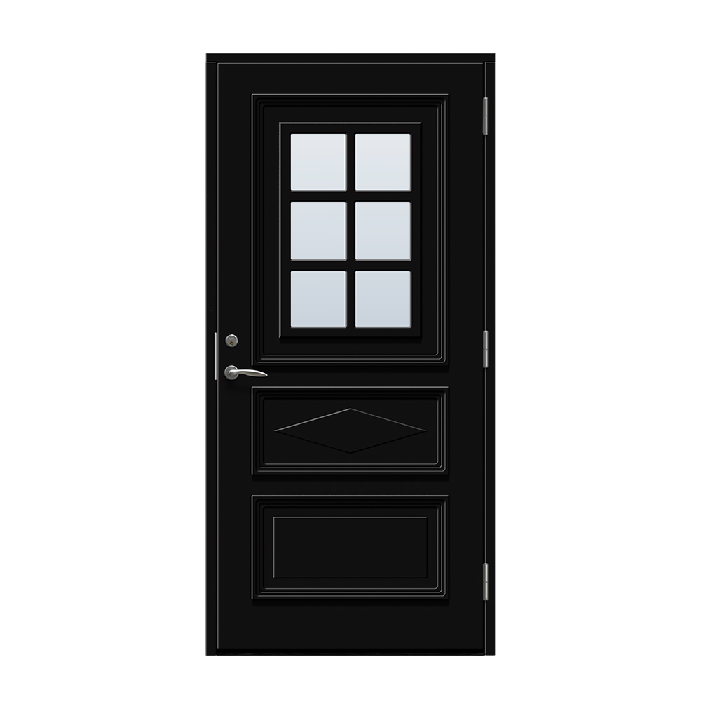 Borgholm är en entrédörr med fönster och snygga dekorer på dörrbladet. Dörren har en slät insida.