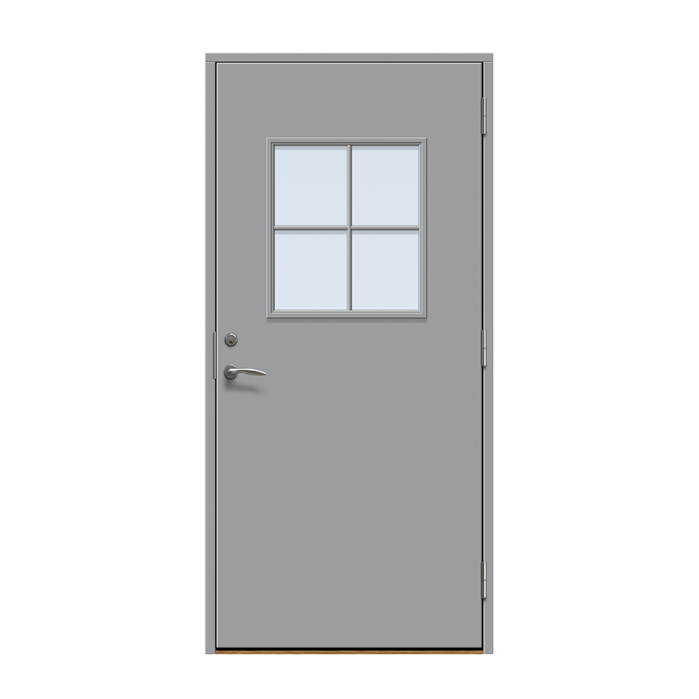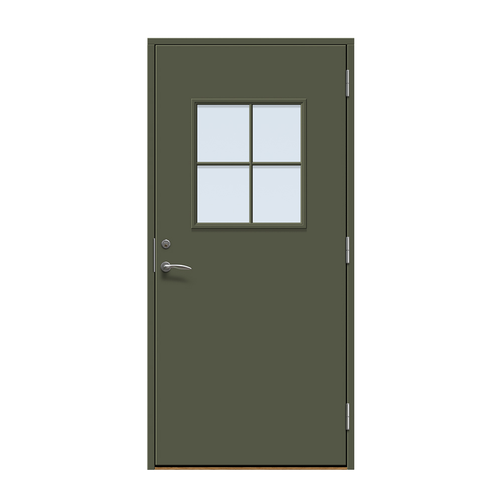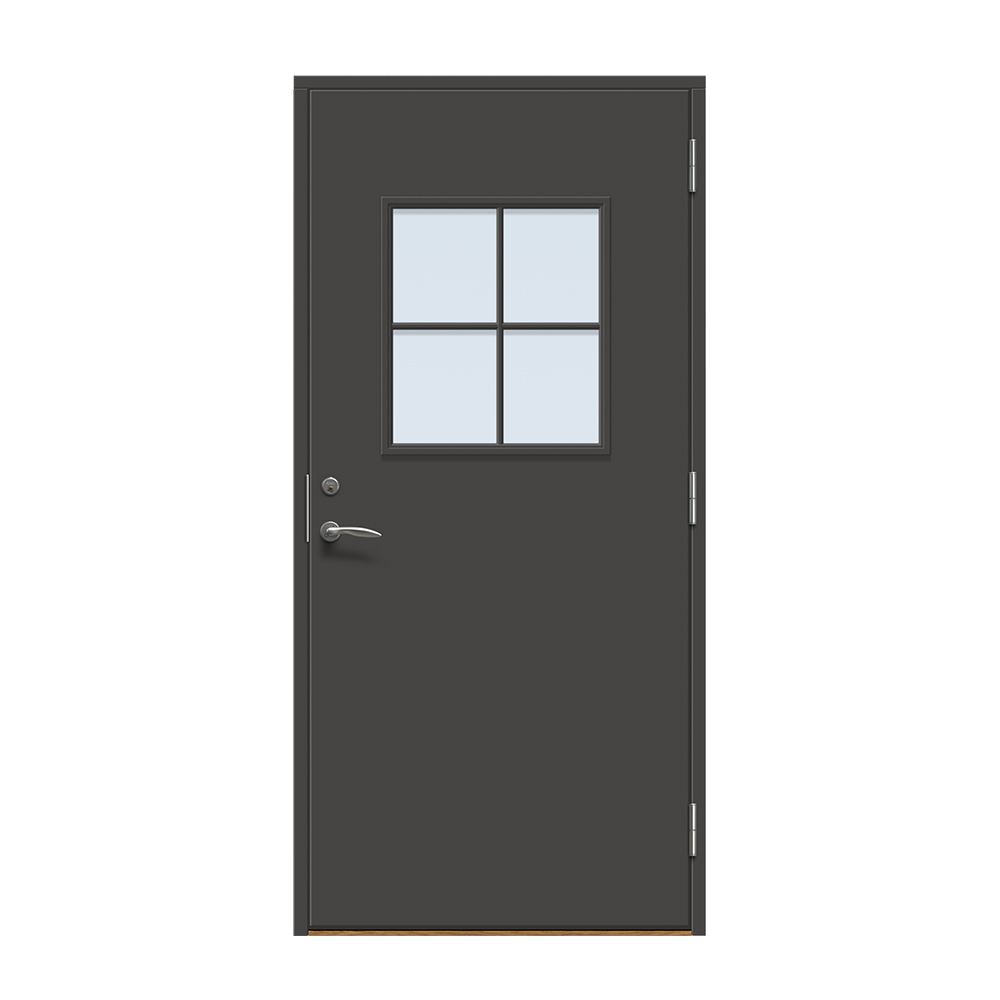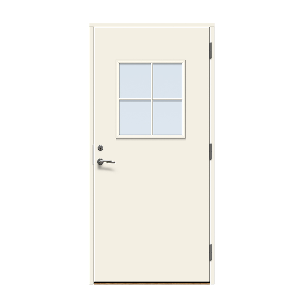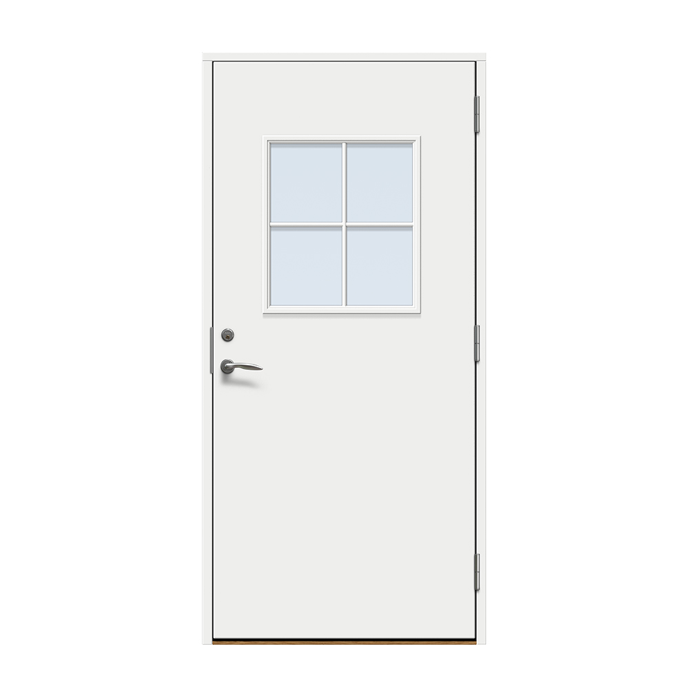 Ekeby är en traditionell entrédörr med slät utsida och ett större fönster med spröjs.