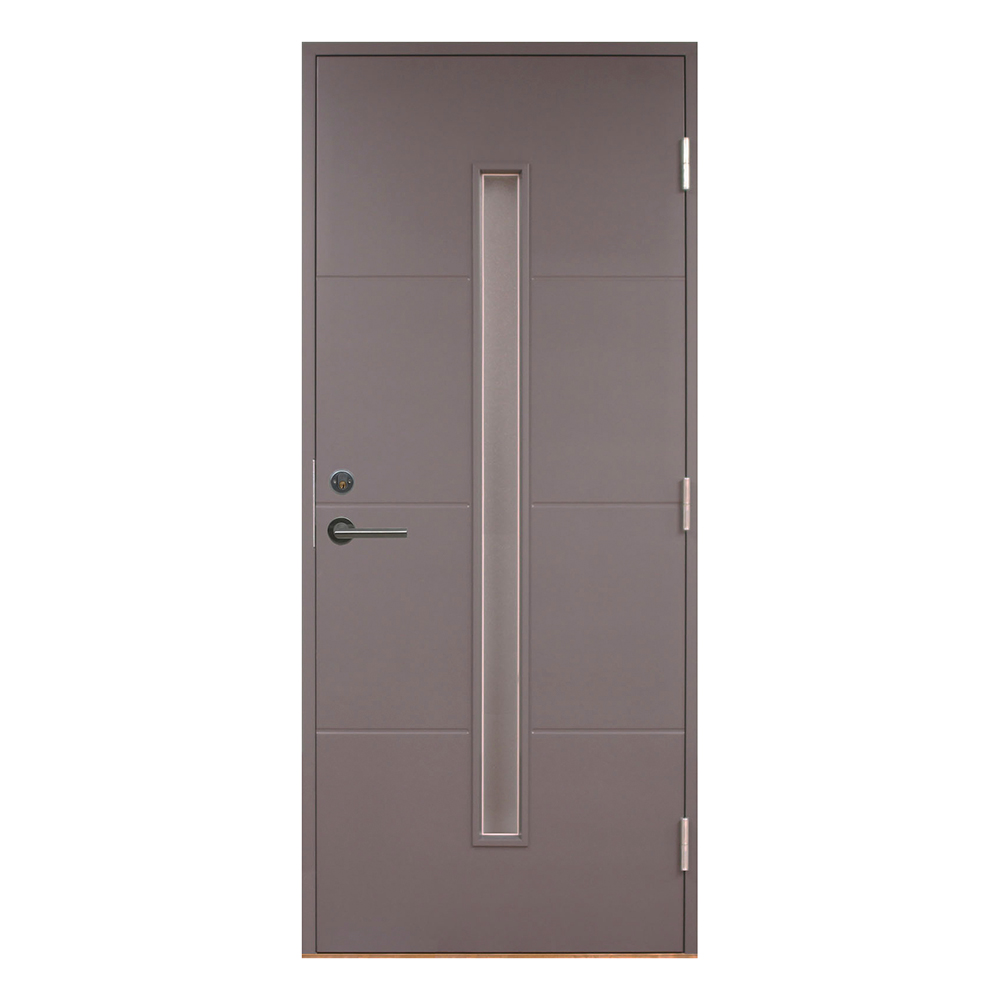Ekhult är en ytterdörr med modern design. Ekhult har ett smalt avlångt fönster med crepiglas som ger ett fint ljusinsläpp i hallen. Ytterdörren har tre spår på utsidan och en slät insida.