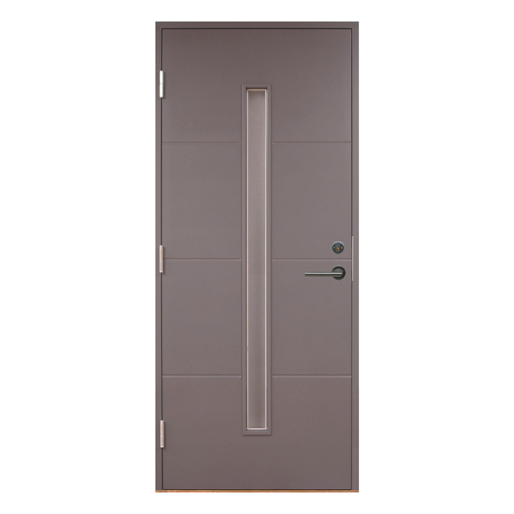 Ekhult är en ytterdörr med modern design. Ekhult har ett smalt avlångt fönster med crepiglas som ger ett fint ljusinsläpp i hallen. Ytterdörren har tre spår på utsidan och en slät insida.