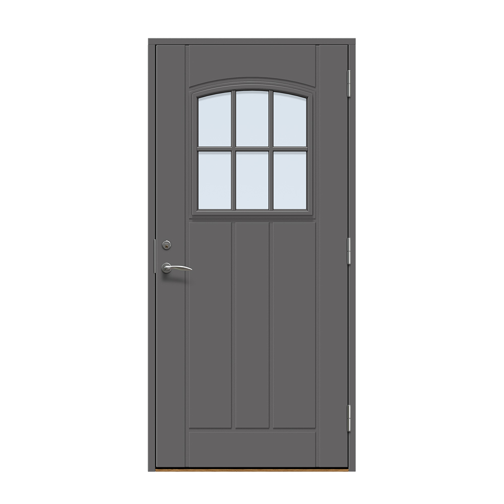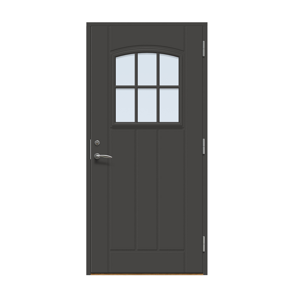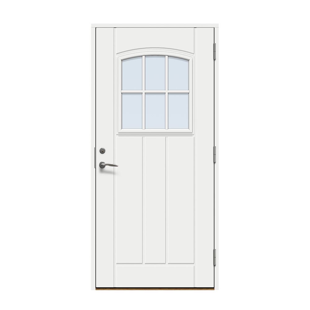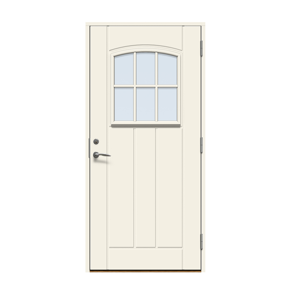 Hittarp är en entrédörr med ett klassiskt fönster som har fasta spröjs och en spårfräst utsida. Dörren har en slät insida.