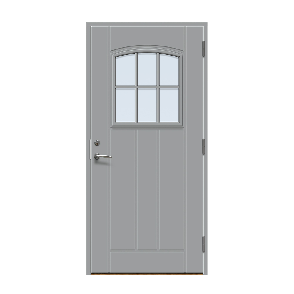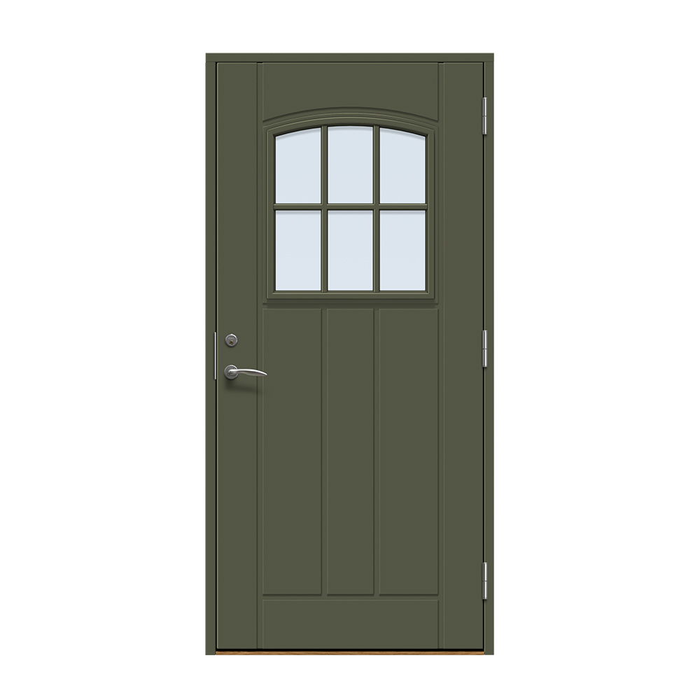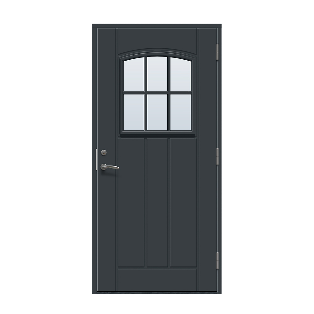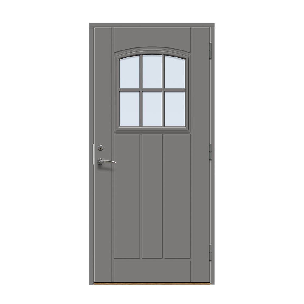 Hittarp är en entrédörr med ett klassiskt fönster som har fasta spröjs och en spårfräst utsida. Dörren har en slät insida.