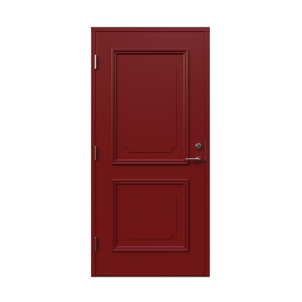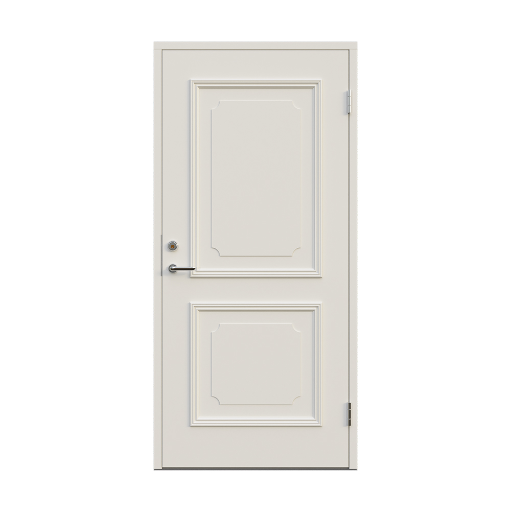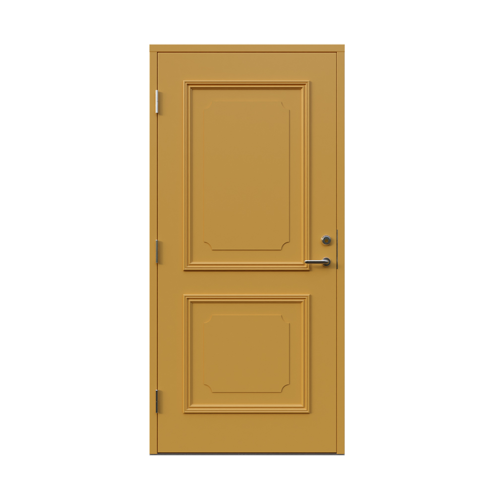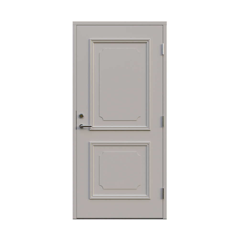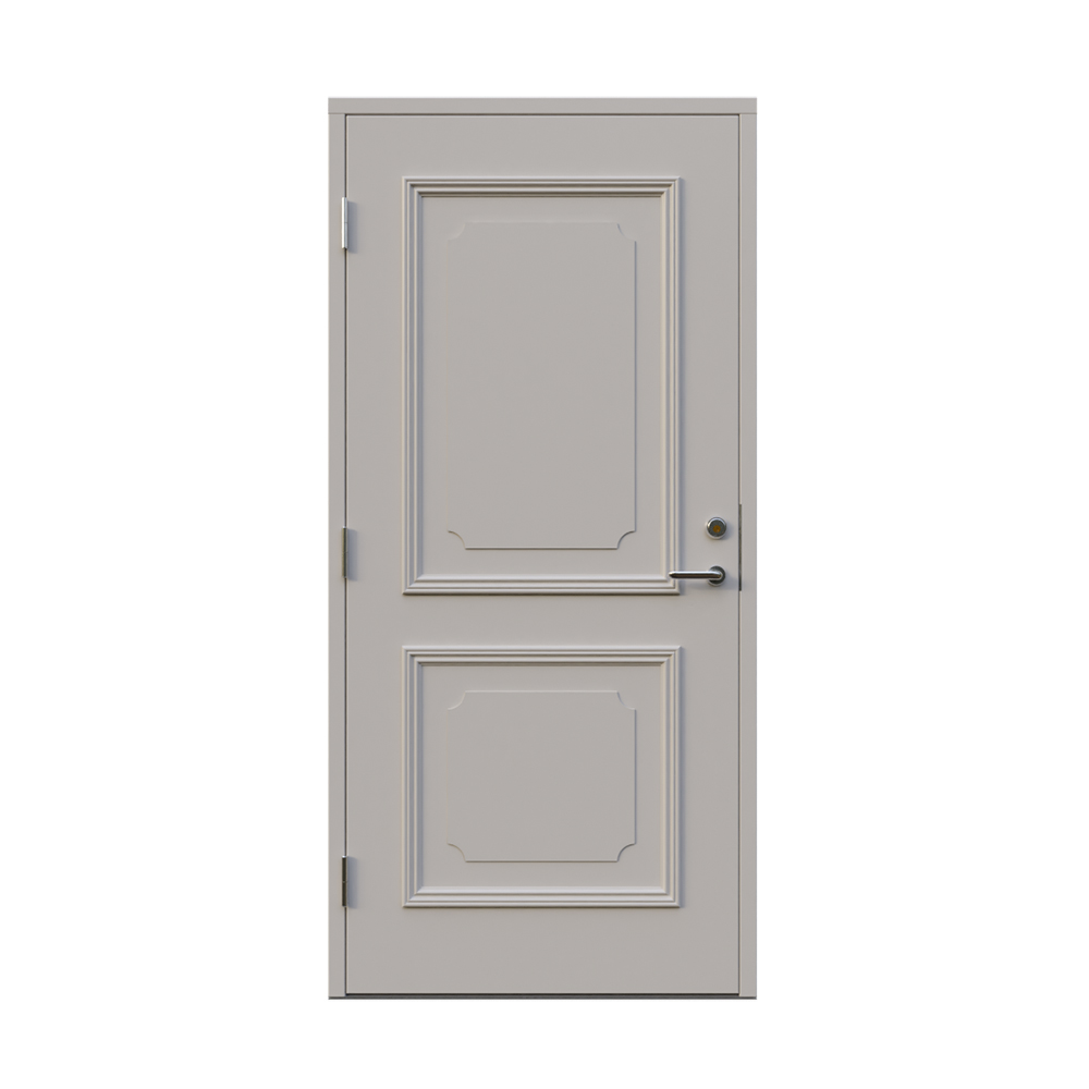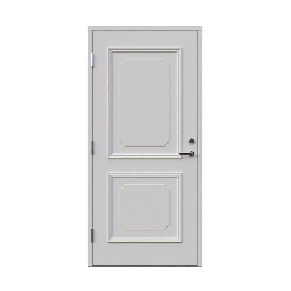 Denna dörren är inbrottsskyddad som standard och har 74 mm tjockt dörrblad och dubbelt ramträ, vilket ger en mer ljuddämpande konstruktion.