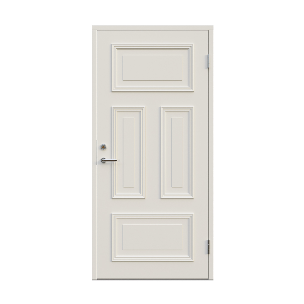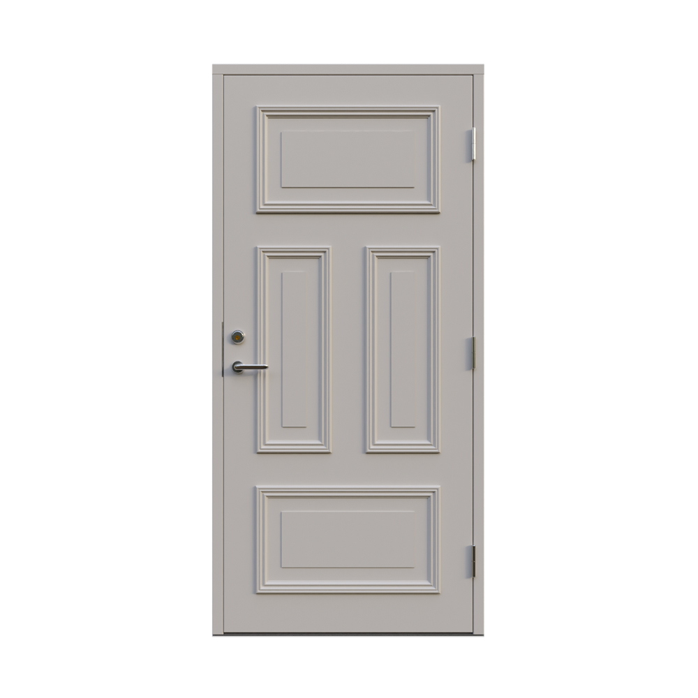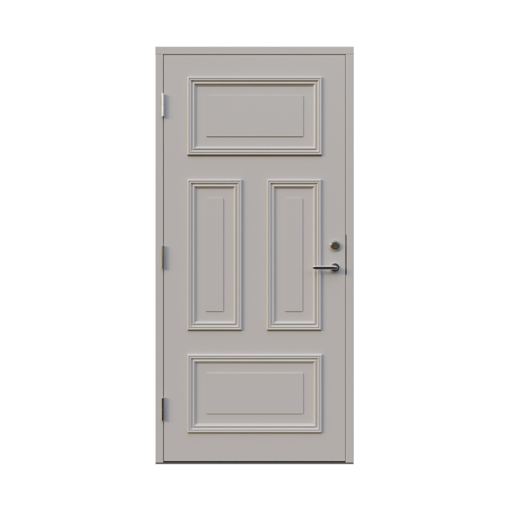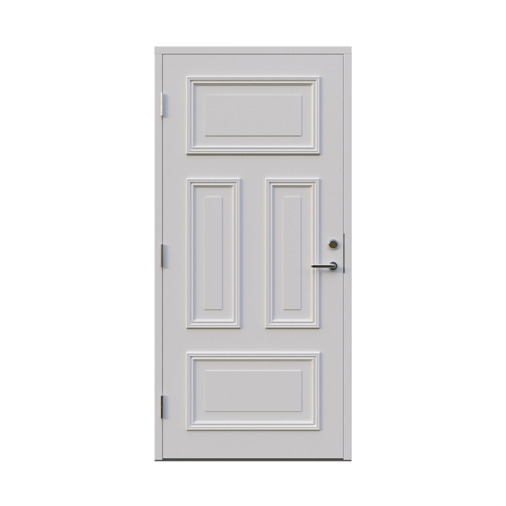 Denna dörren är inbrottsskyddad som standard och har 74 mm tjockt dörrblad och dubbelt ramträ, vilket ger en mer ljuddämpande konstruktion.