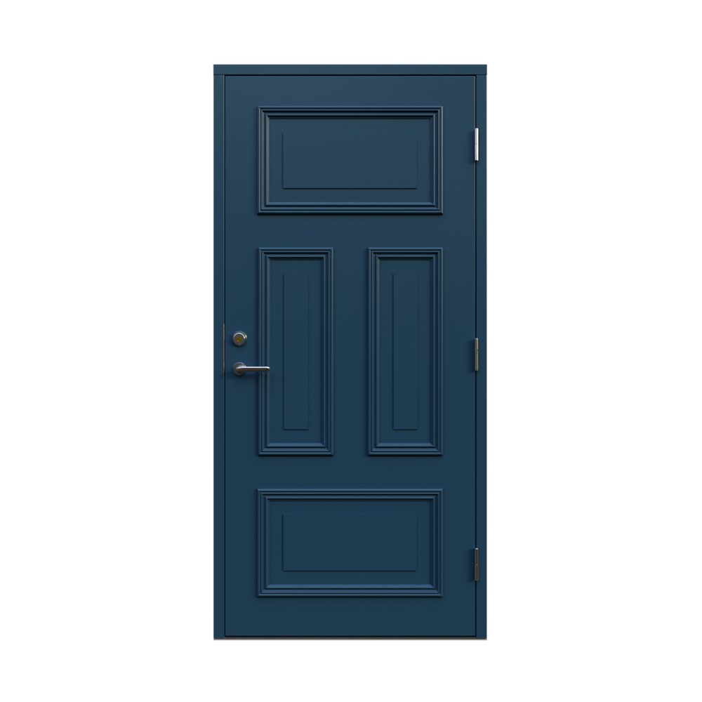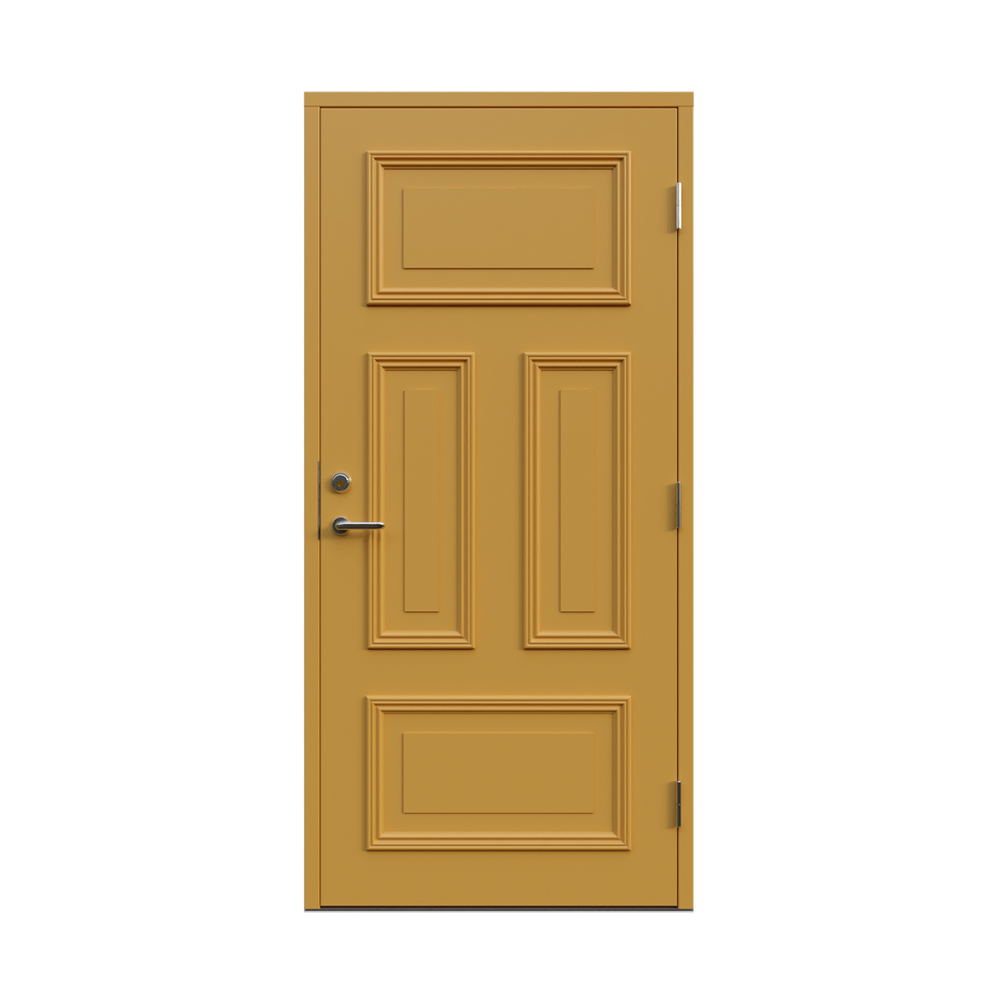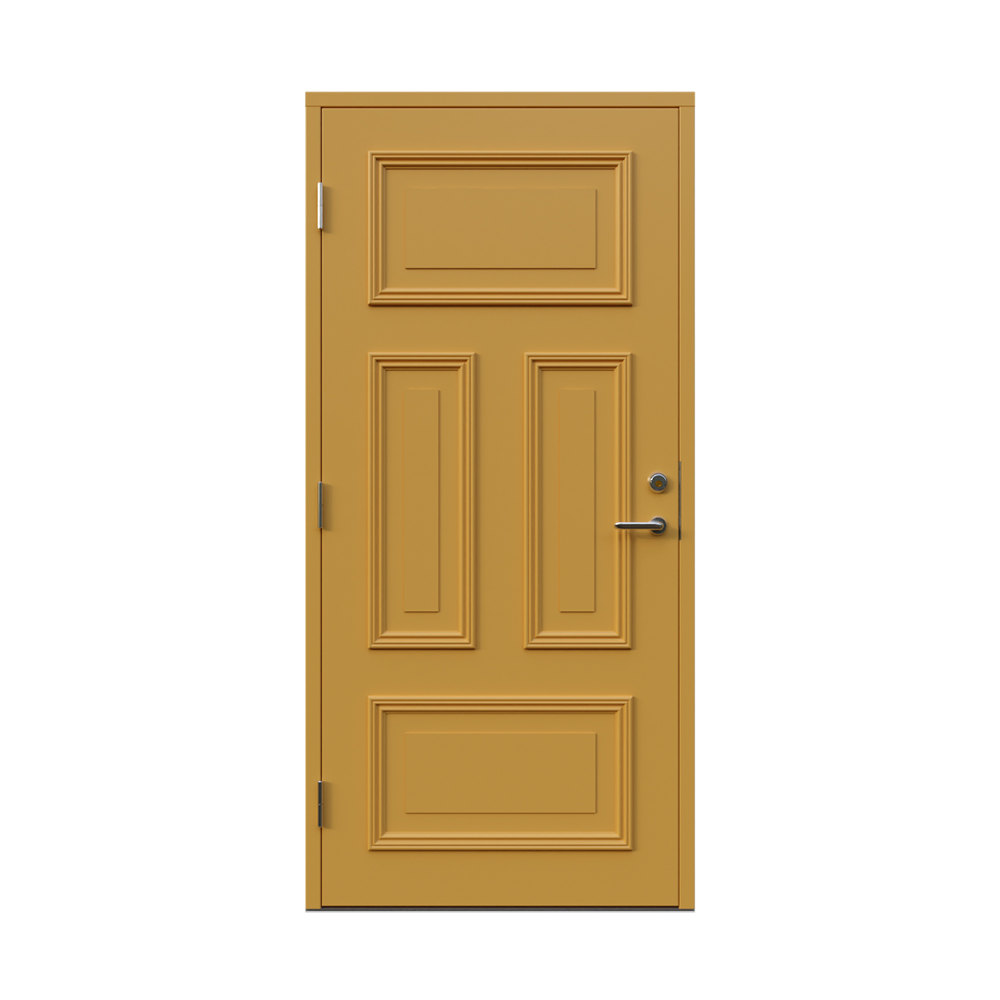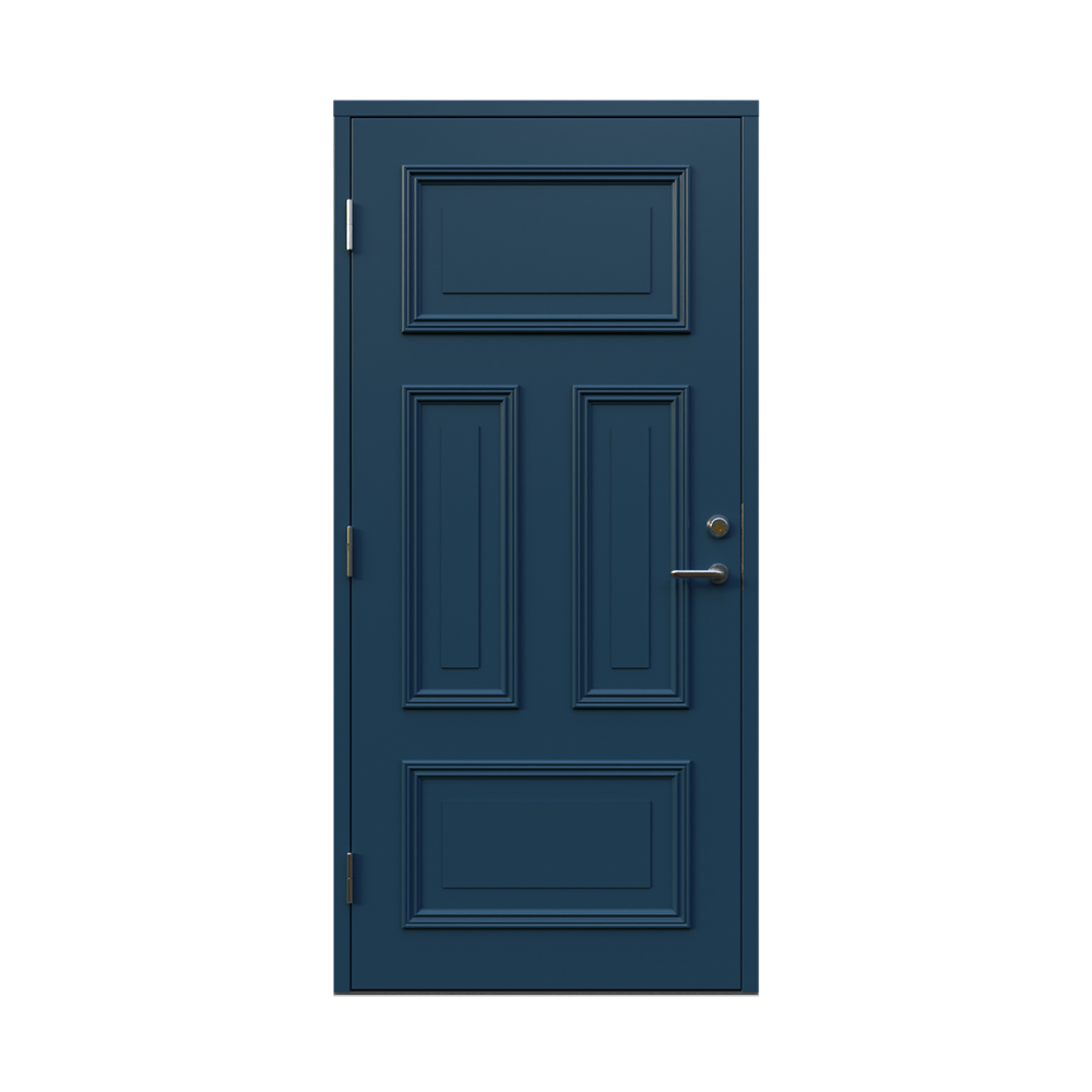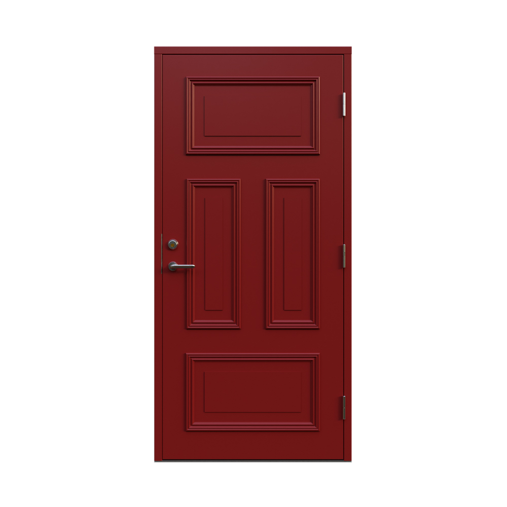 Denna dörren är inbrottsskyddad som standard och har 74 mm tjockt dörrblad och dubbelt ramträ, vilket ger en mer ljuddämpande konstruktion.