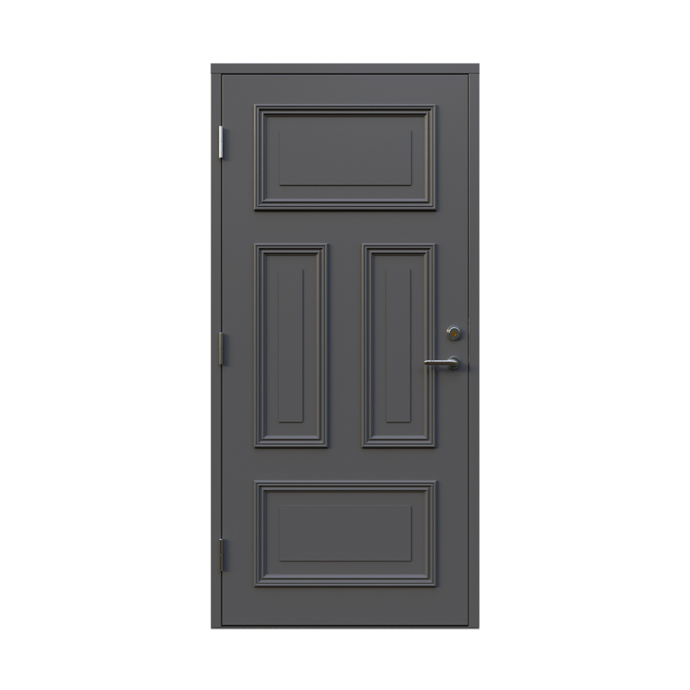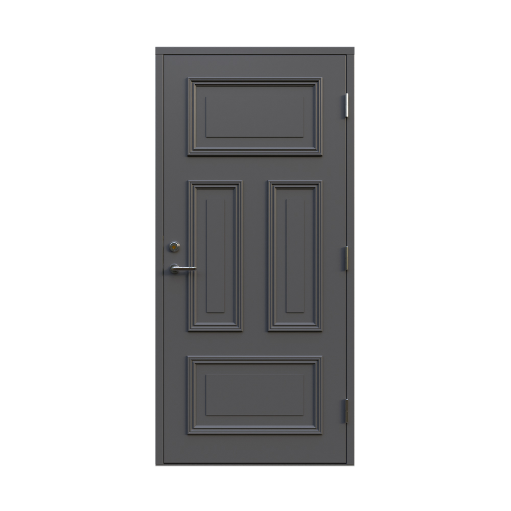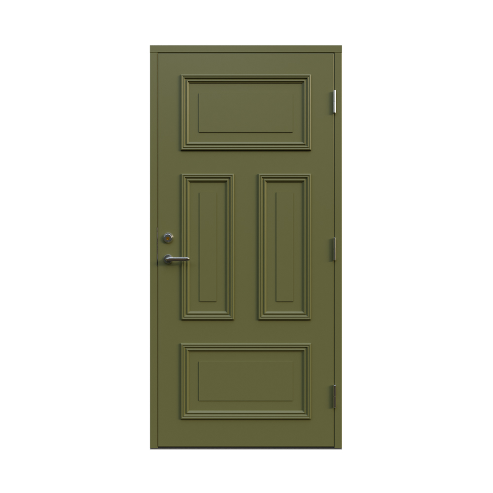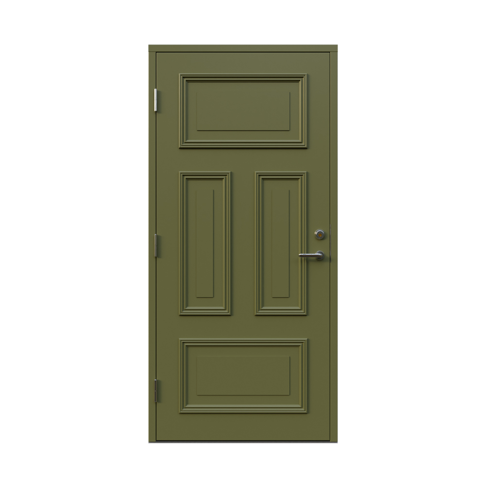 Denna dörren är inbrottsskyddad som standard och har 74 mm tjockt dörrblad och dubbelt ramträ, vilket ger en mer ljuddämpande konstruktion.