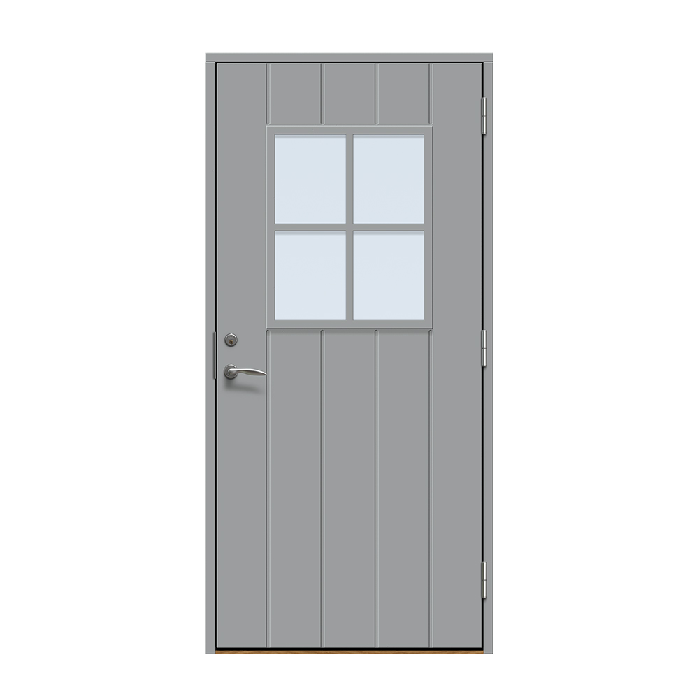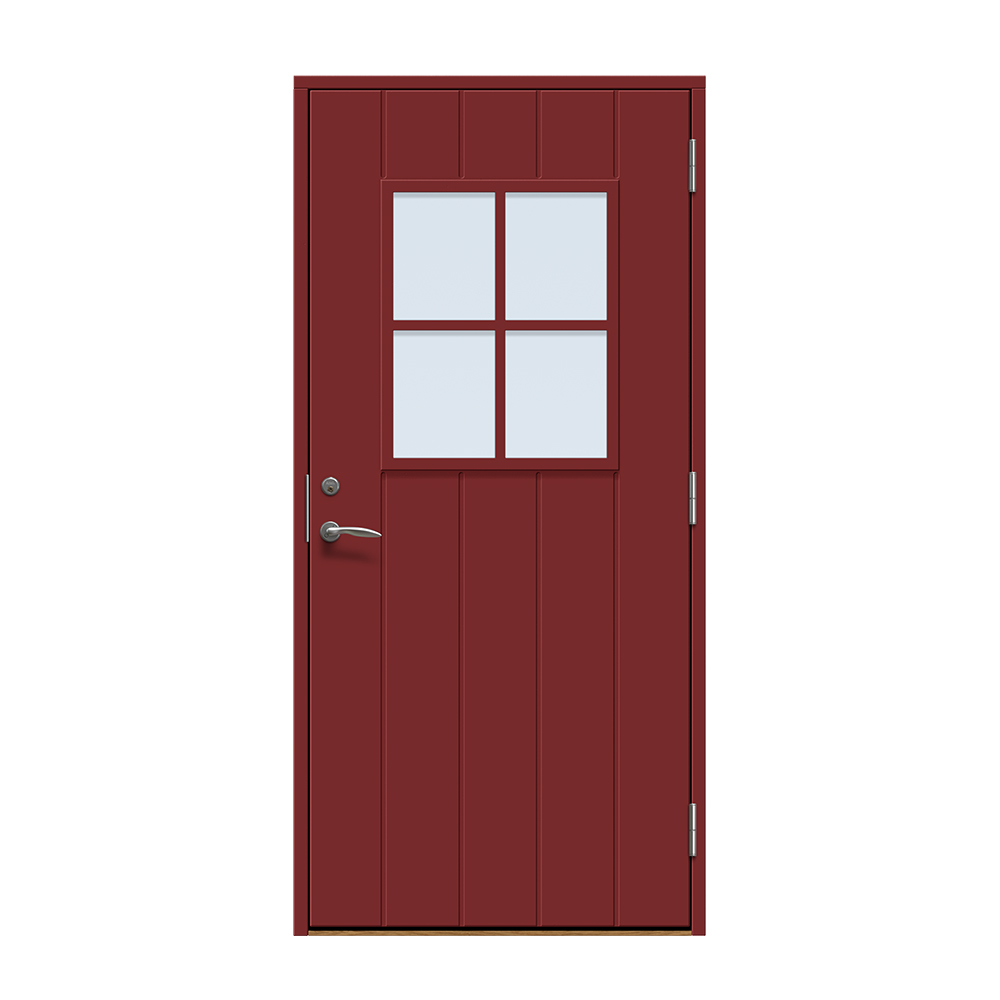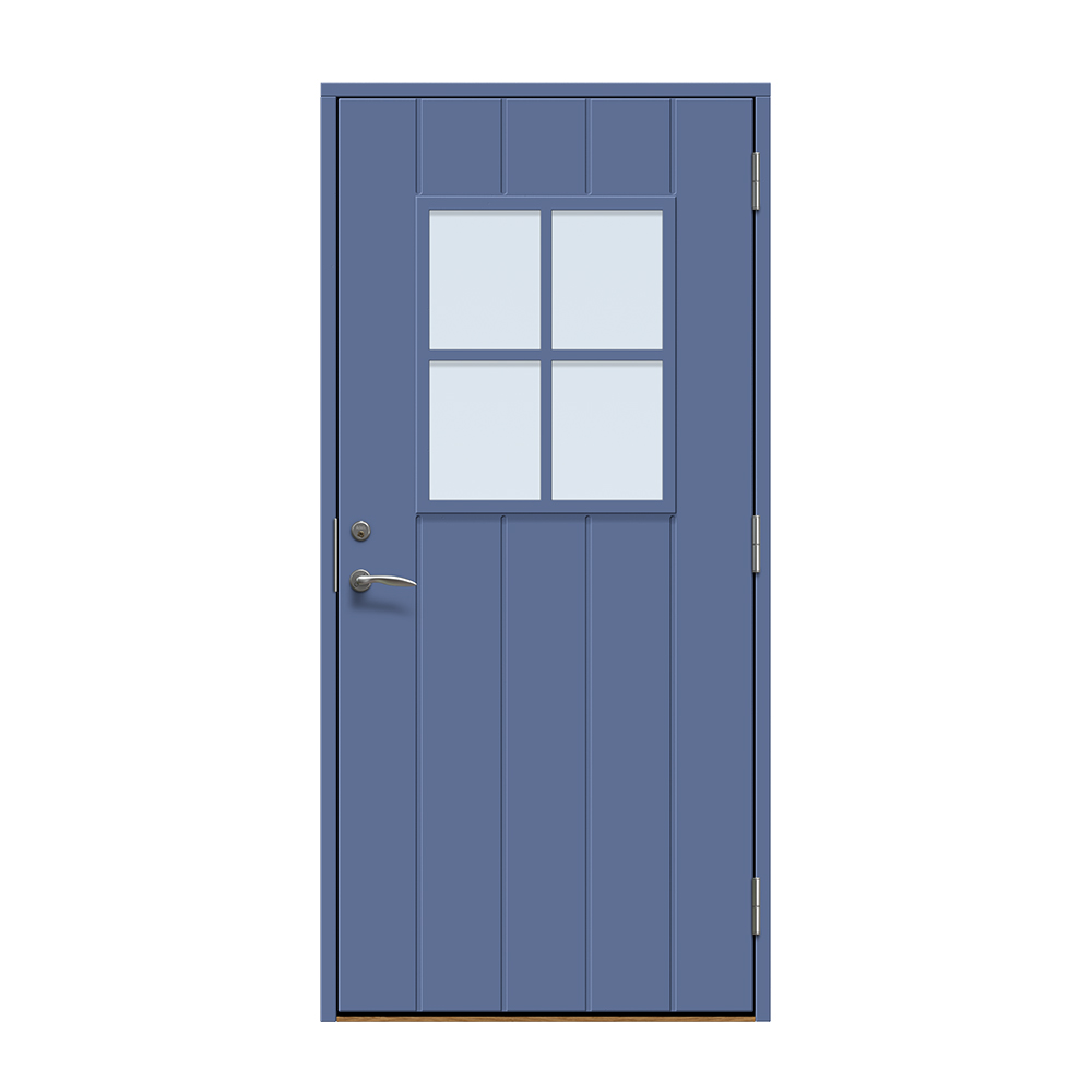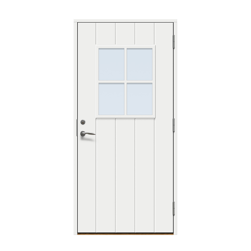 Dörren är täckt av en tålig faner. Behandlingen som appliceras på dörrens träfibrer gör att dörren tål extrema mängder vatten med minimal rörelse och svullnad. Dörren blir mycket tålig och färgen fäster bättre vilket ger längre underhållsintervall. Om dörren har fönster kommer glaset vara laminerat för extra styrka.