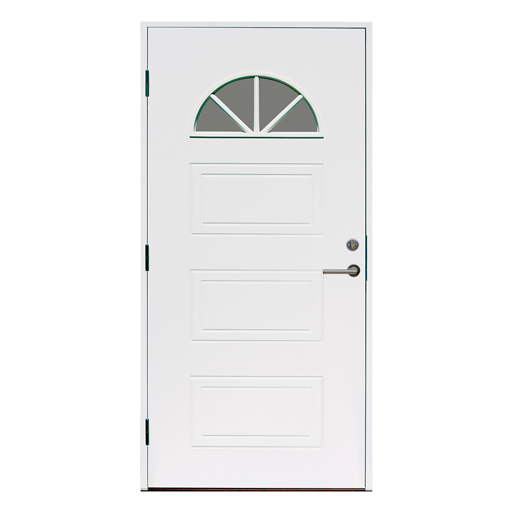 En ytterdörr med en lantlig design som passar perfekt till flera typer av villor. Lindhult har ett klassiskt spårfräst mönster på utsidan och en slät insida. Dörrens halvmånefönster har spröjs och klarglas.