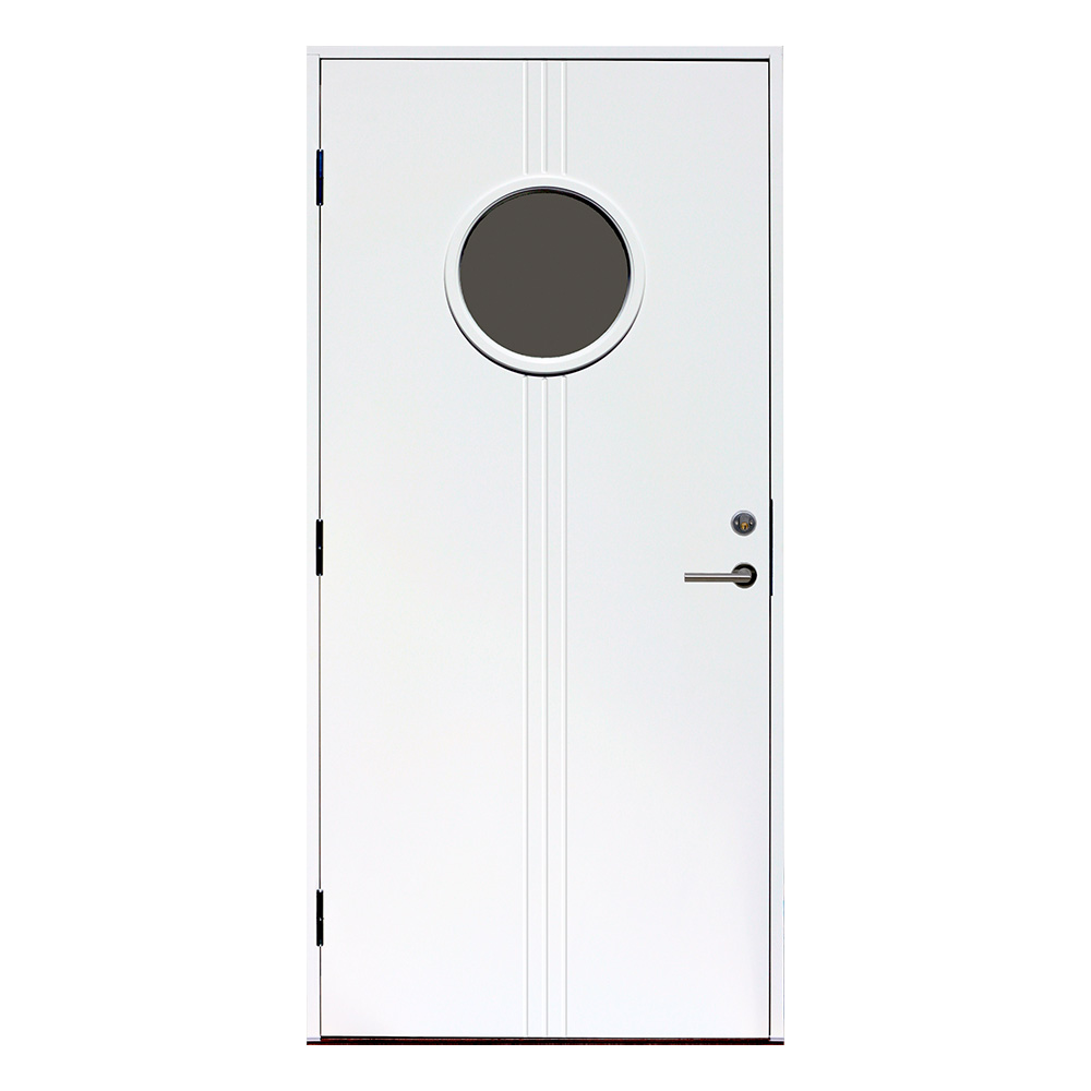 En klassisk ytterdörr med runt glas som passar de flesta typer av hem. Månhult ytterdörr har ett spårfräst mönster på utsidan och en slät insida. Glaset i dörrens fönster är av klarglas vilket ger ett generöst ljusinsläpp.