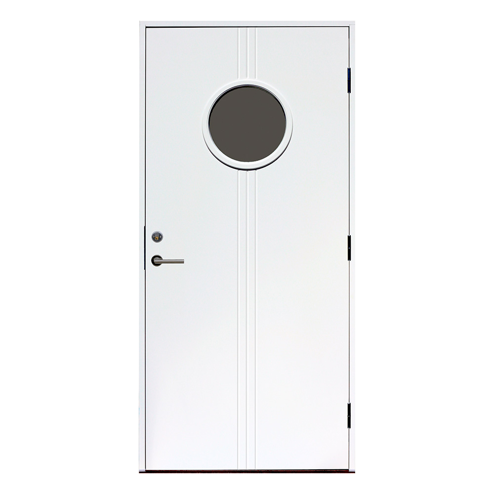 En klassisk ytterdörr med runt glas som passar de flesta typer av hem. Månhult ytterdörr har ett spårfräst mönster på utsidan och en slät insida. Glaset i dörrens fönster är av klarglas vilket ger ett generöst ljusinsläpp.