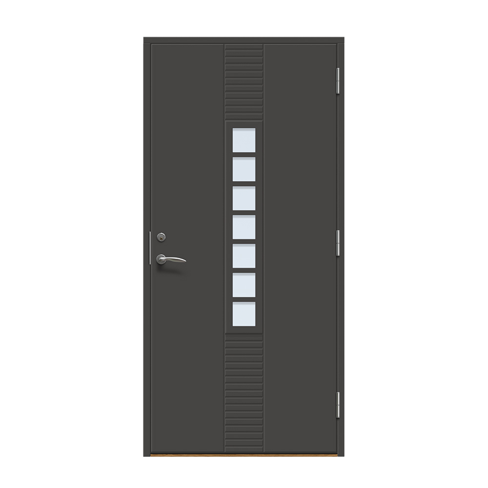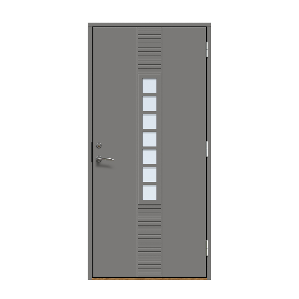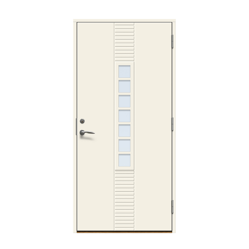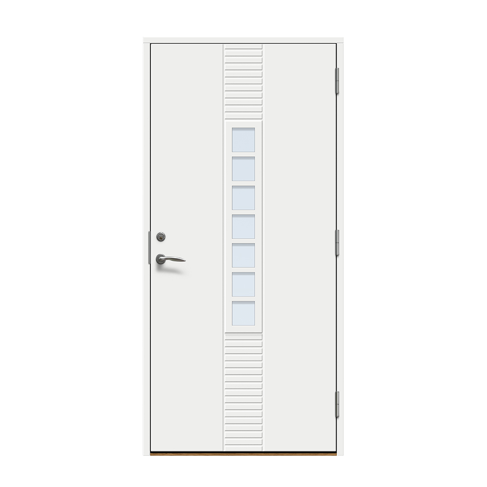 Mölle är en ytterdörr med sju mindre rutor i följd och unik spårning på utsidan. Ger ett behagligt ljusinsläpp. Dörren har en slät insida.