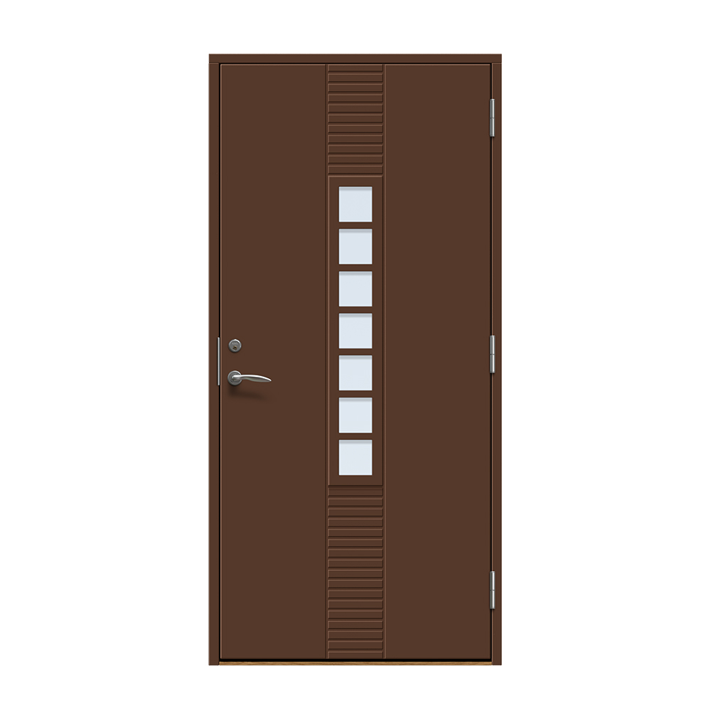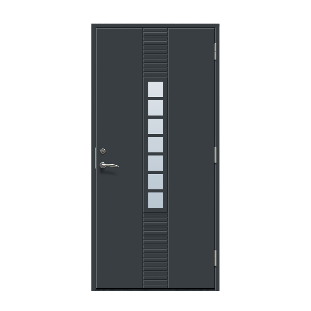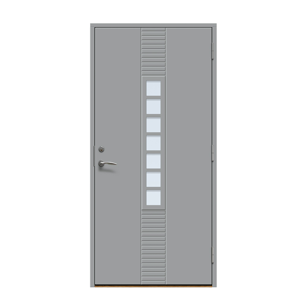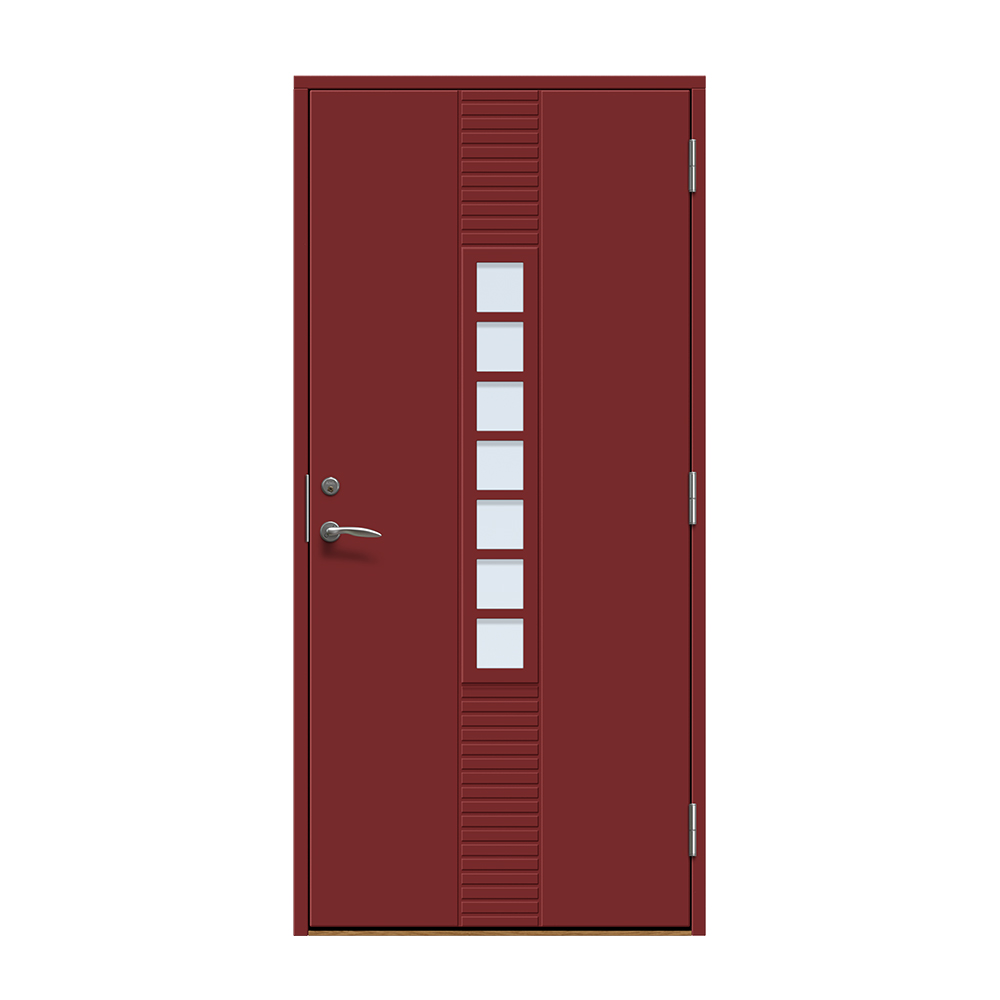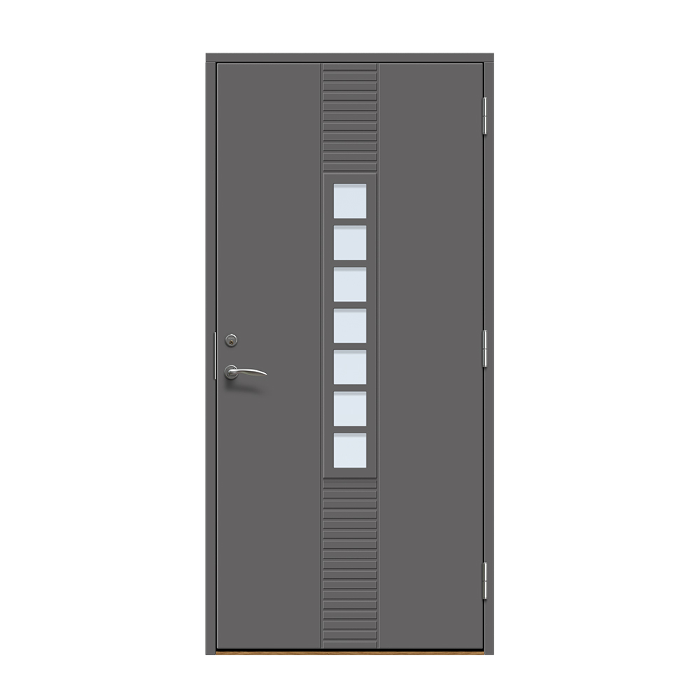 Mölle är en ytterdörr med sju mindre rutor i följd och unik spårning på utsidan. Ger ett behagligt ljusinsläpp. Dörren har en slät insida.