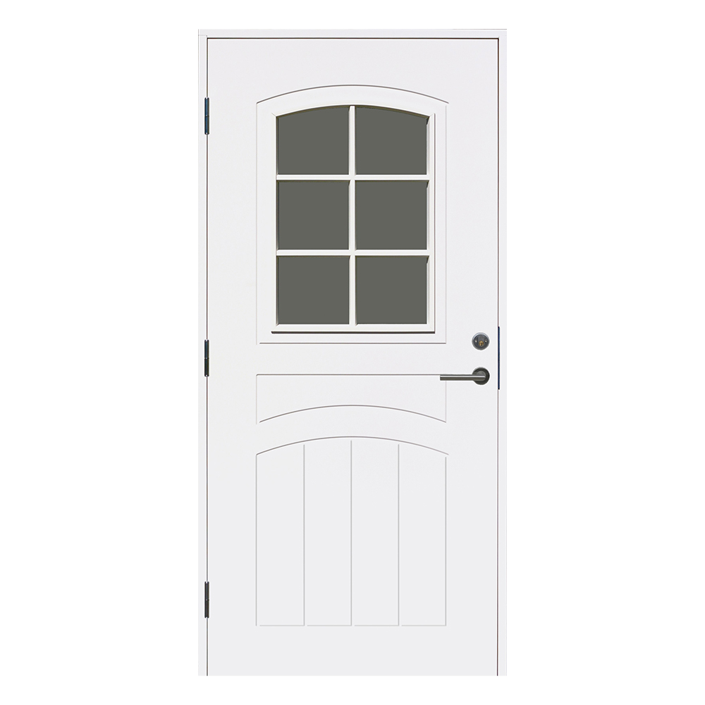 Ytterdörren Pålshult är en dörr som passar perfekt till hemmet med en lantlig känsla. Dörren har en klassisk spårfräst dekor på utsidan och en slät insida. Det stora fönstret har spröjs och traditionellt cotswoldglas som ger generöst med ljusinsläpp i din hall, utan att ge för mycket insyn.