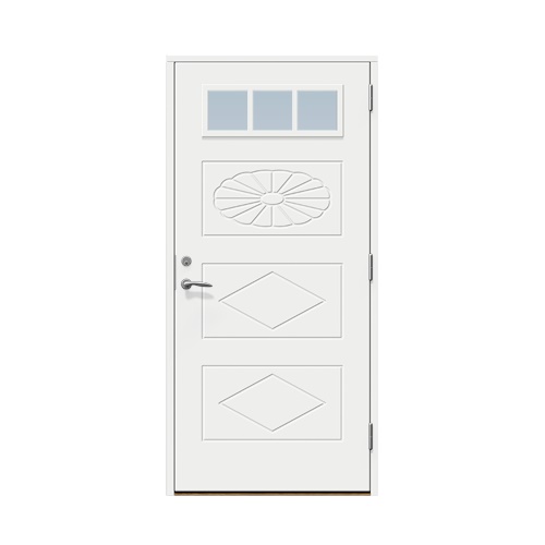 KULÖR Vattenbaserad målningsteknik. Vi rekommenderar inte ommålning av ytterdörren eftersom glaslist och dörr är i olika material och kan reagera olika på den färg som används. Observera att en ytterdörr i mörk kulör ska monteras skyddad från direkt starkt solljus och hög värme för att undvika skevhet och solblekning.