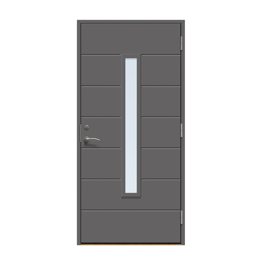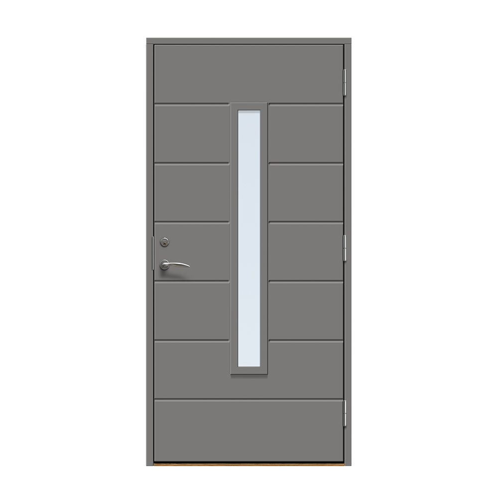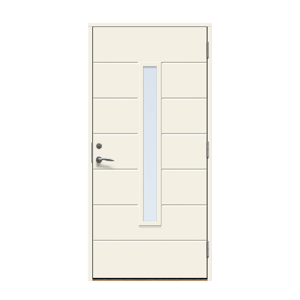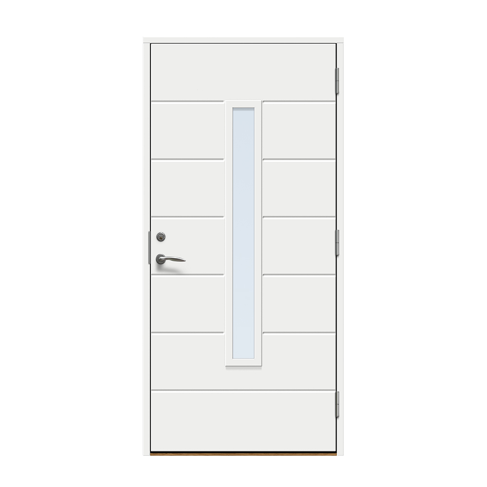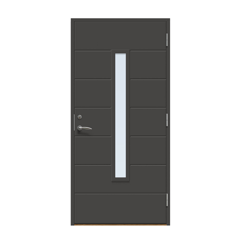 Skanör är en modern entrédörr med ett avlångt fönster för ett alldeles lagom ljusinsläpp i hallen. Dörren har ett spårfräst mönster på utsidan och en slät insida.