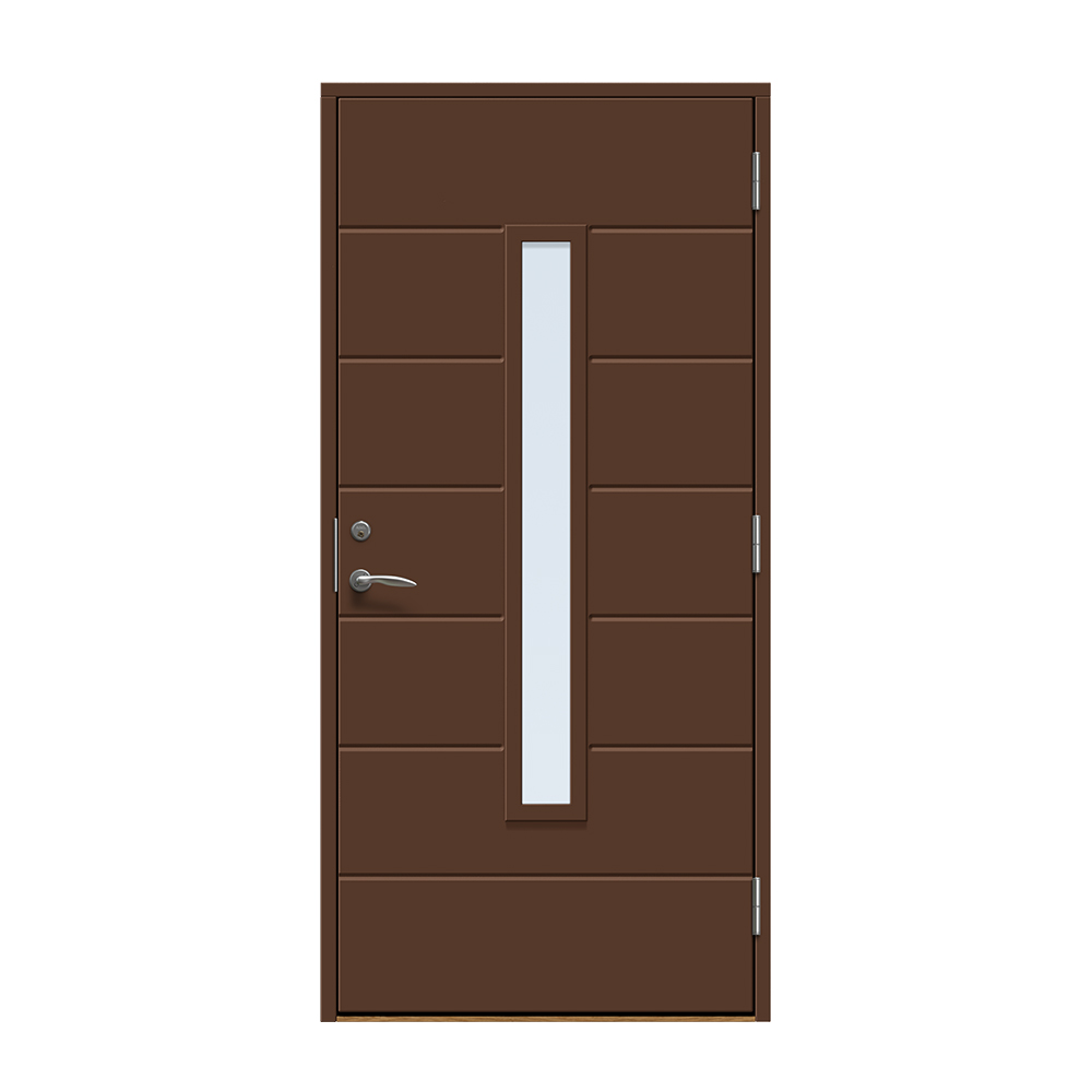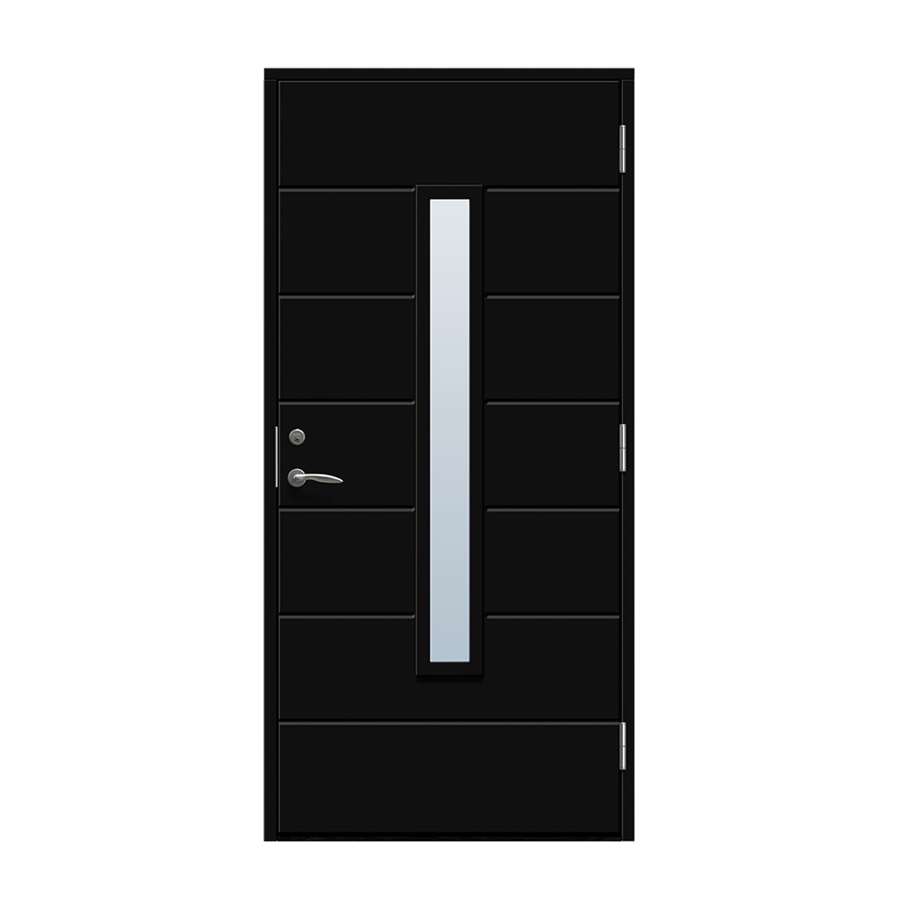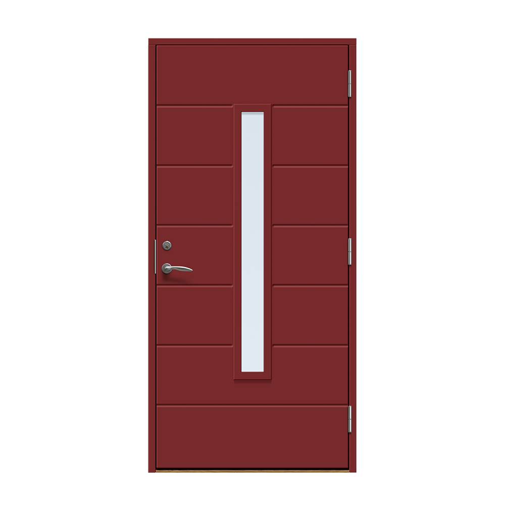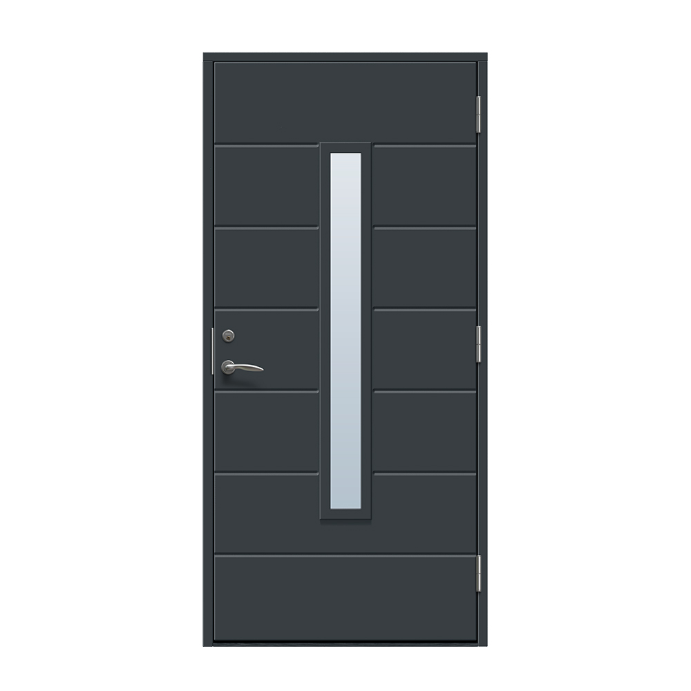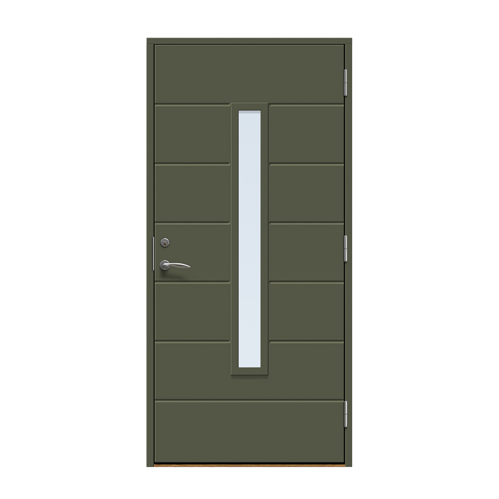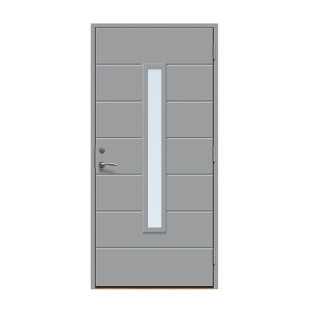 Skanör är en modern entrédörr med ett avlångt fönster för ett alldeles lagom ljusinsläpp i hallen. Dörren har ett spårfräst mönster på utsidan och en slät insida.