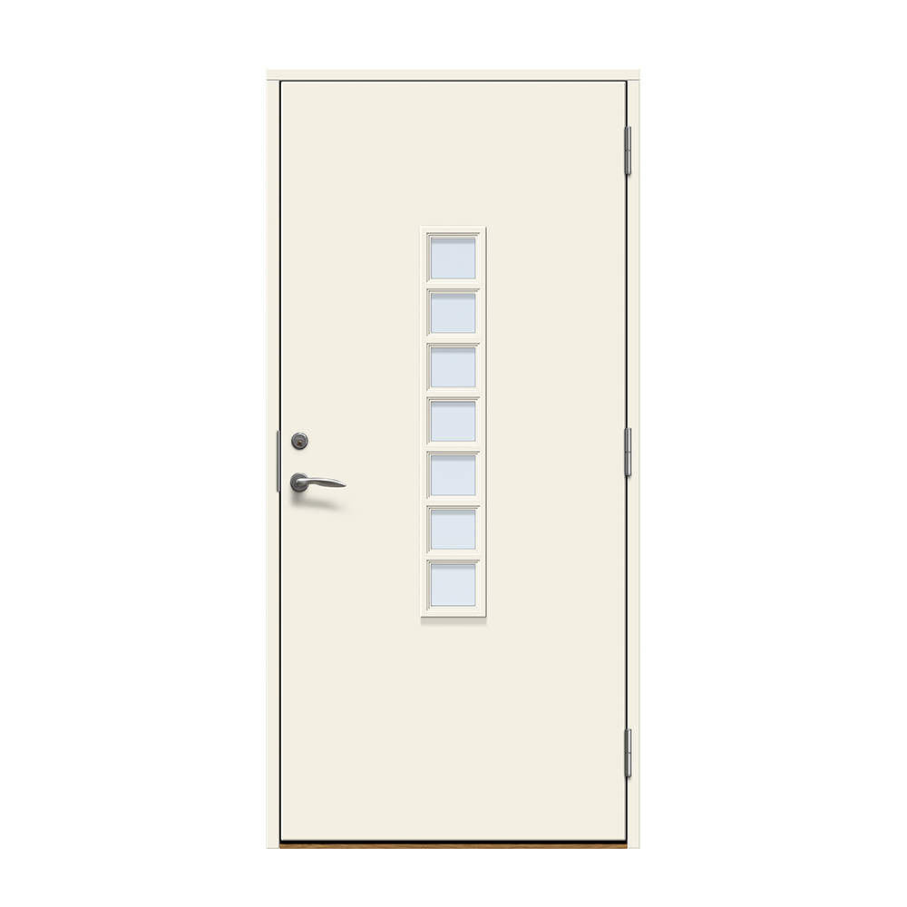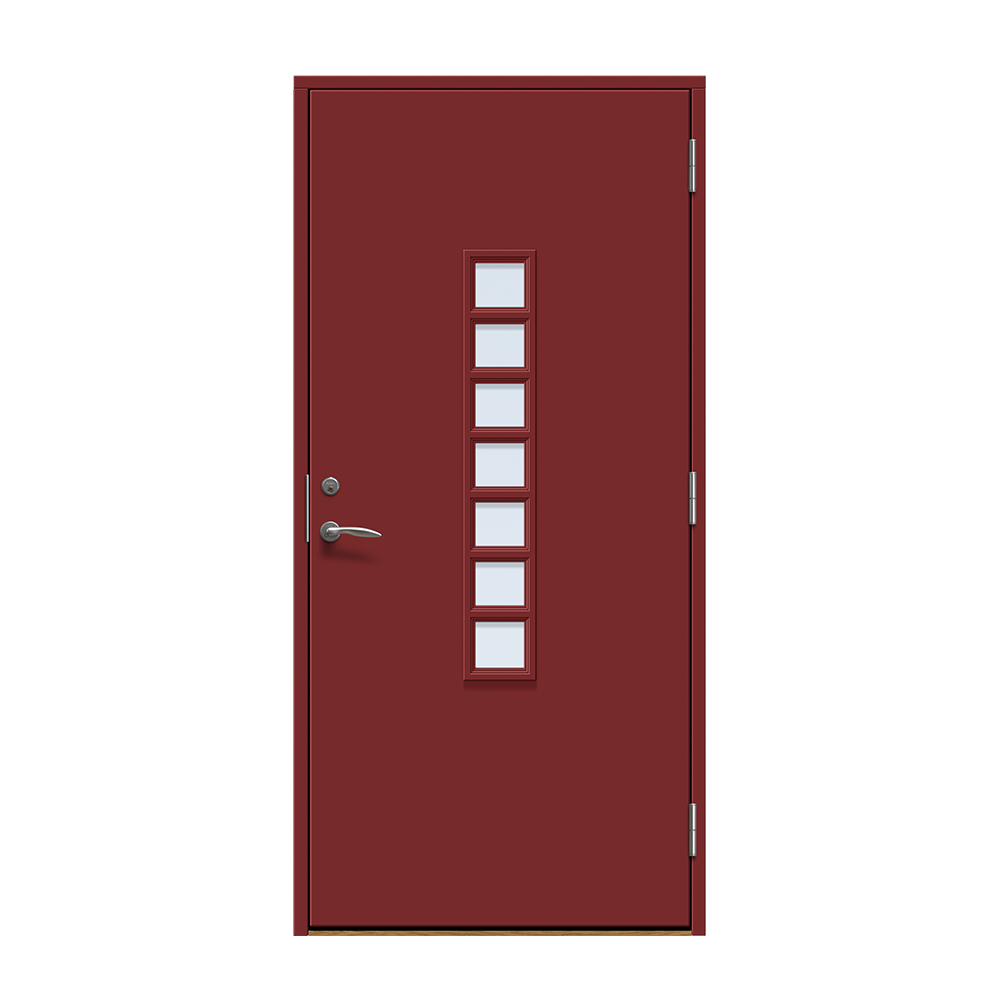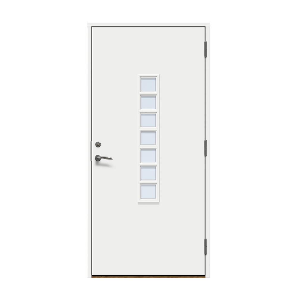 Dörren är täckt av en tålig faner. Behandlingen som appliceras på dörrens träfibrer gör att dörren tål extrema mängder vatten med minimal rörelse och svullnad. Dörren blir mycket tålig och färgen fäster bättre vilket ger längre underhållsintervall. Om dörren har fönster kommer glaset vara laminerat för extra styrka.