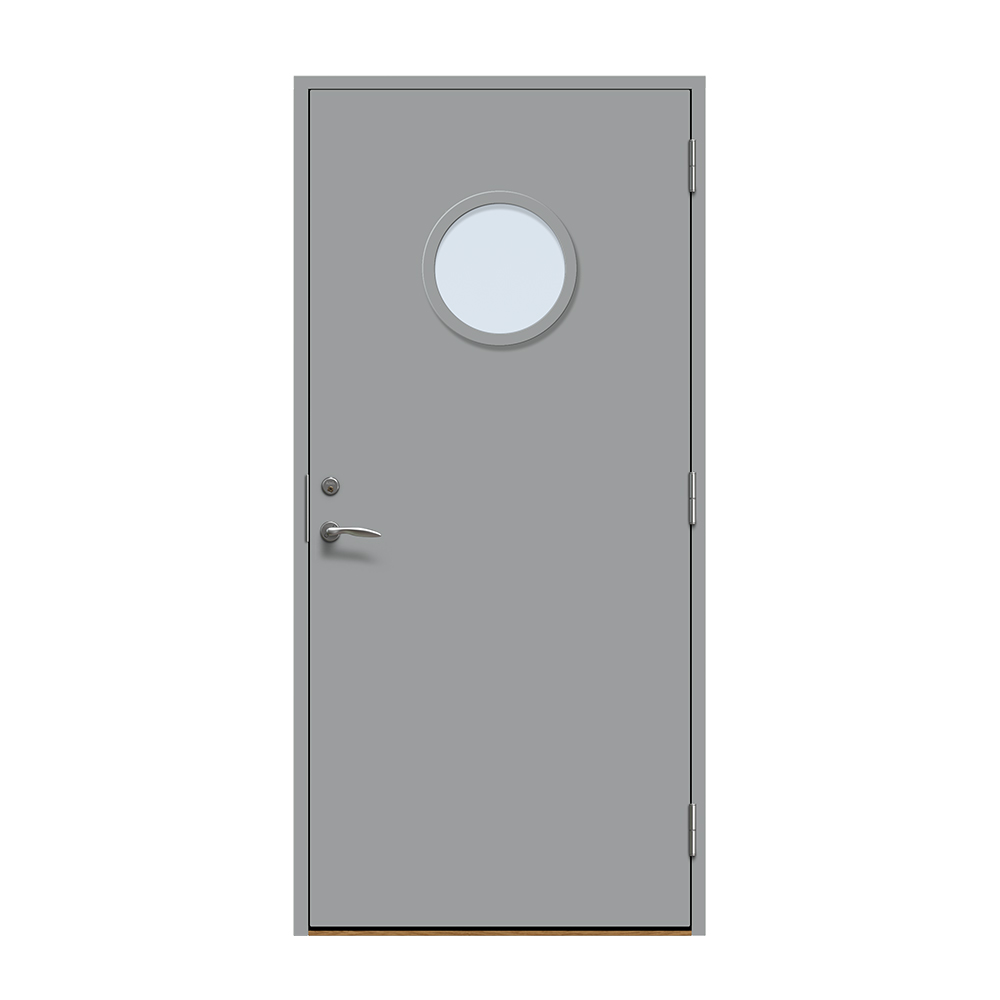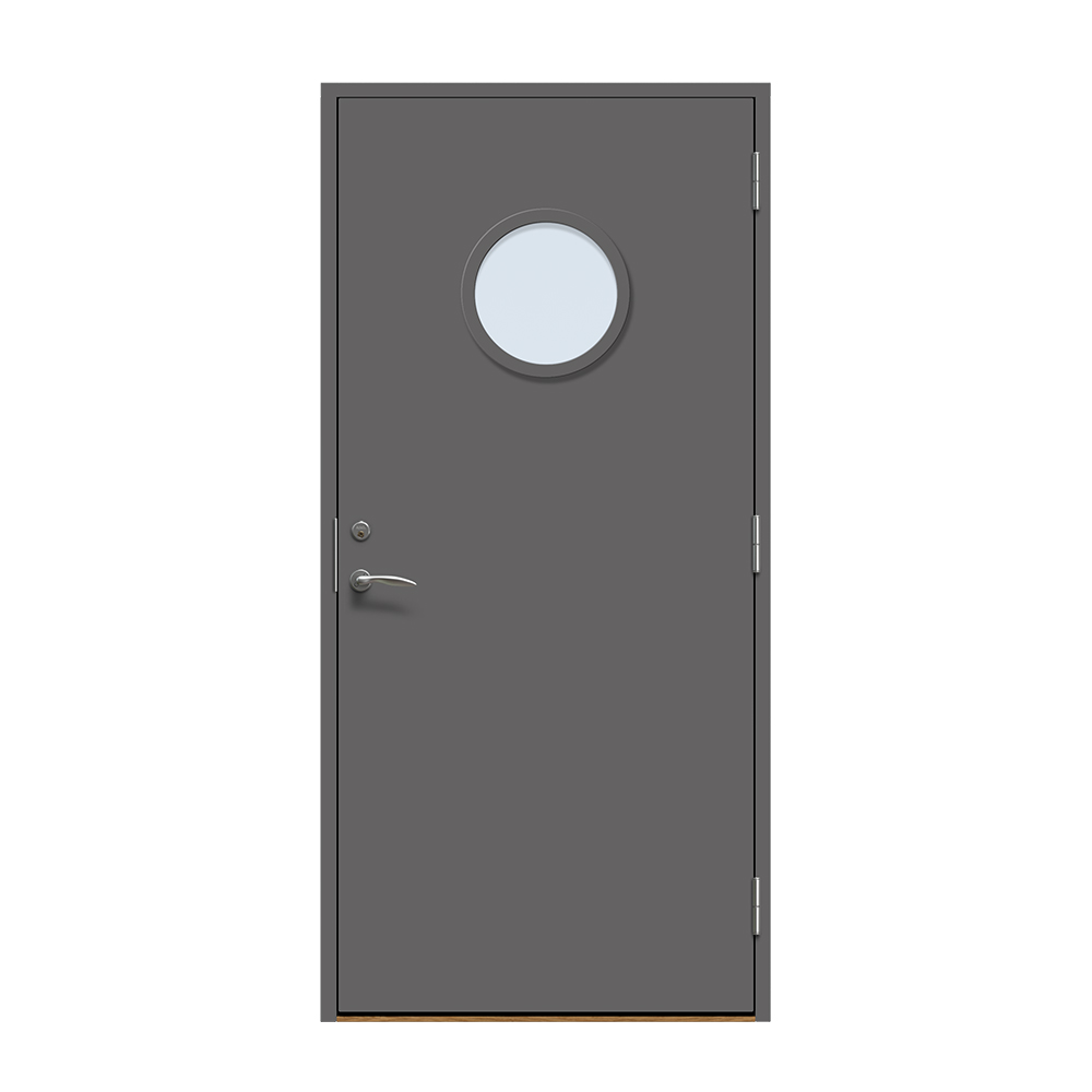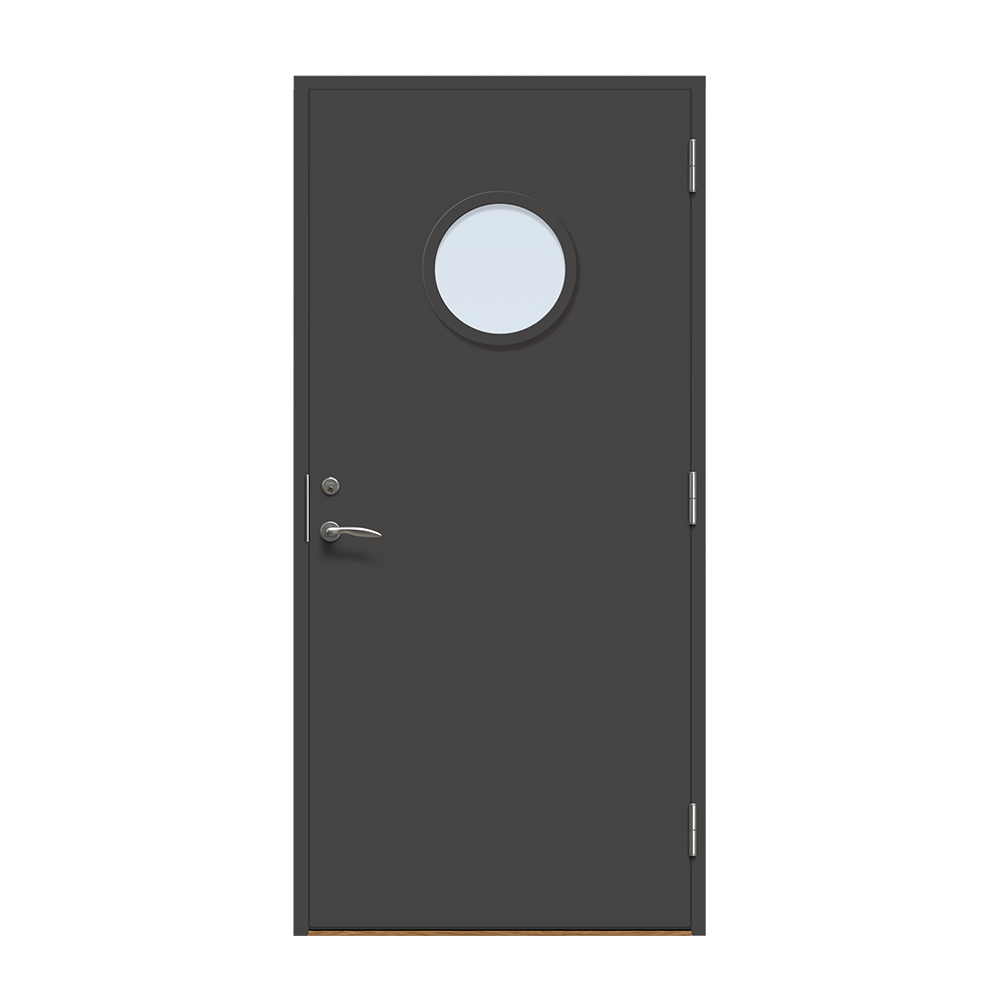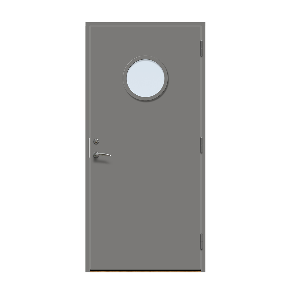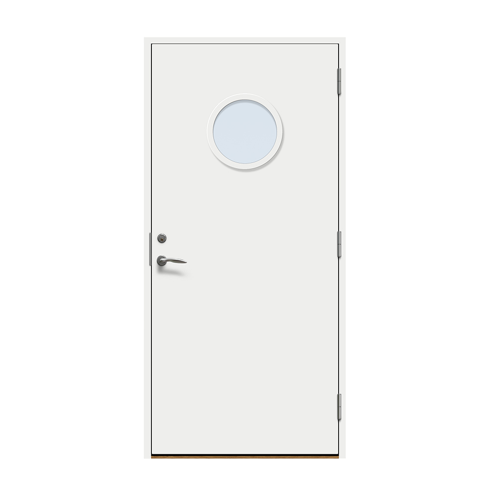Sundvik är en entrédörr med ett runt fönster och slät utsida. Ett populärt val!