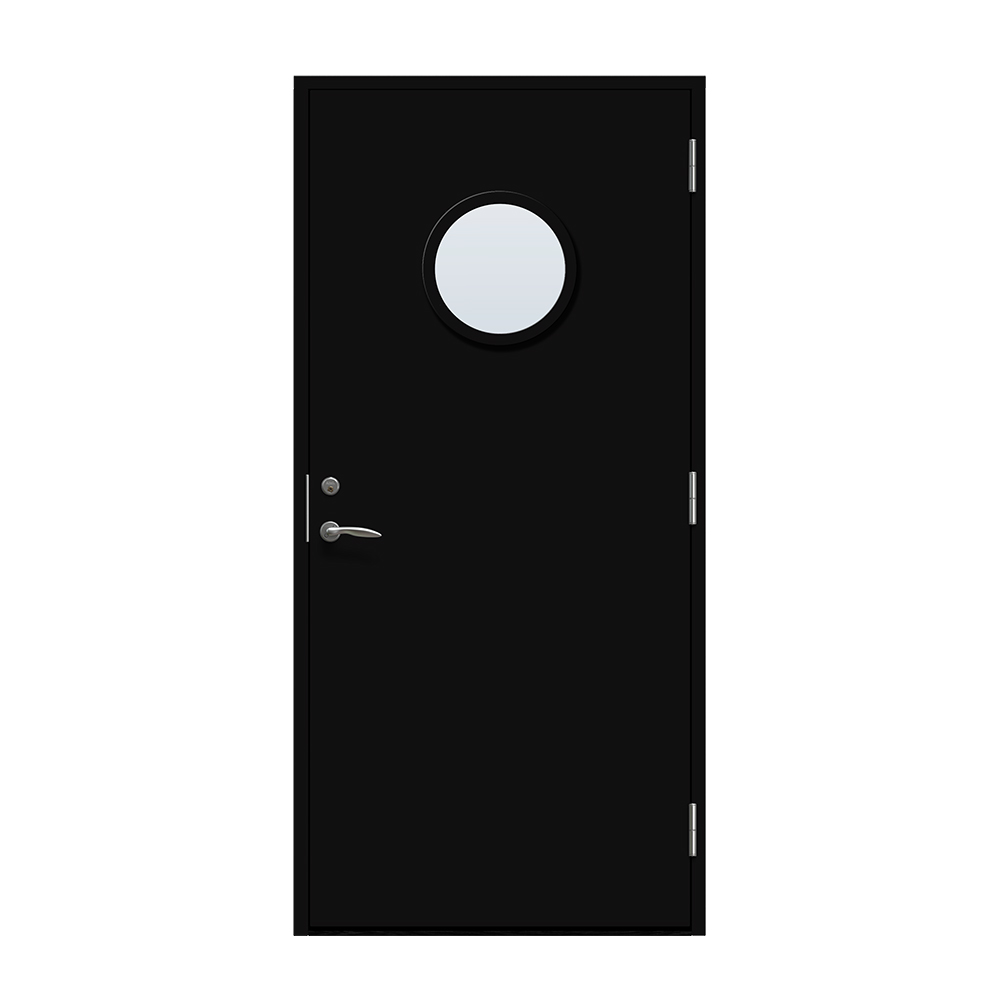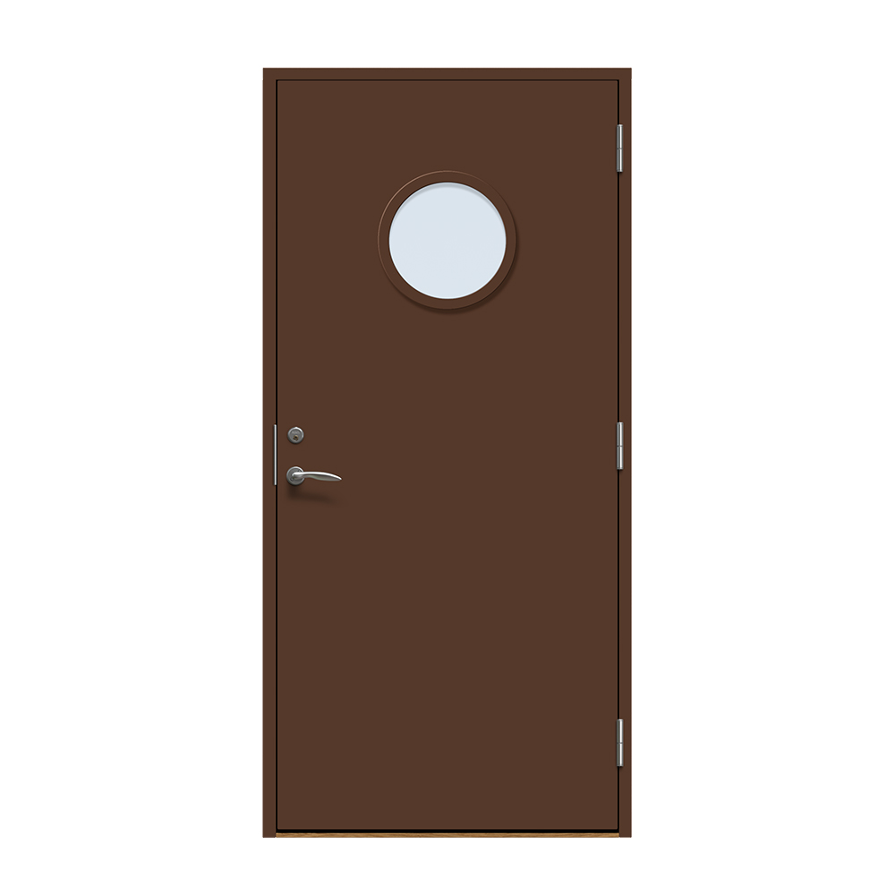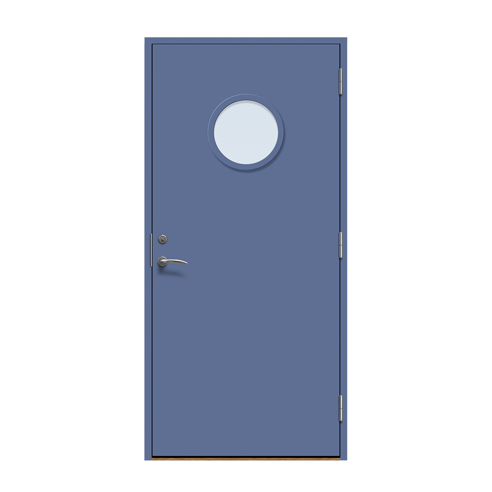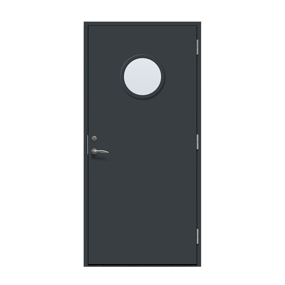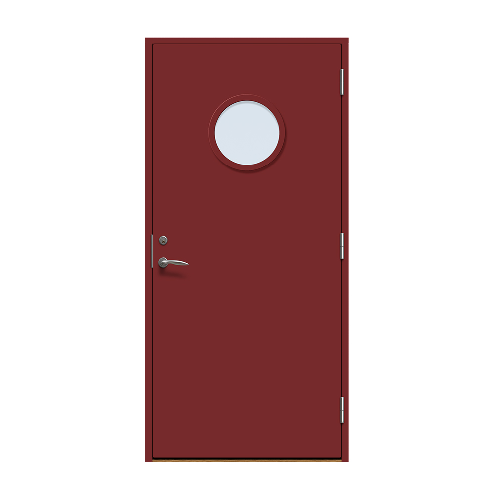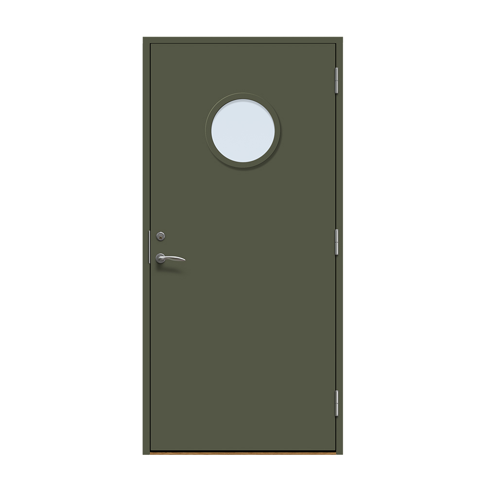 Sundvik är en entrédörr med ett runt fönster och slät utsida. Ett populärt val!