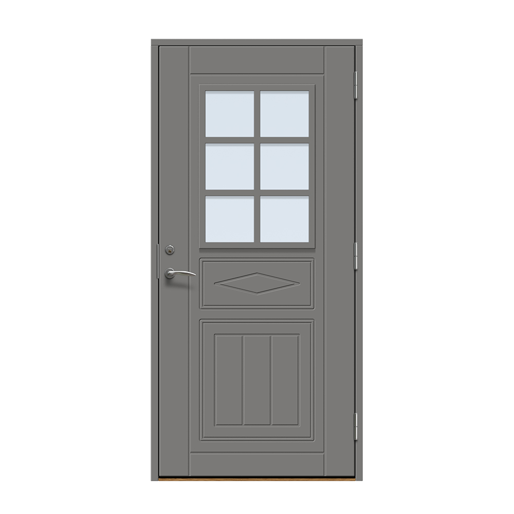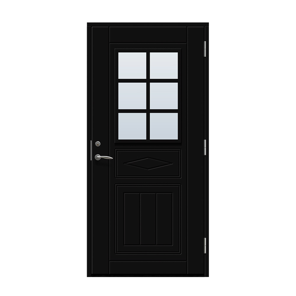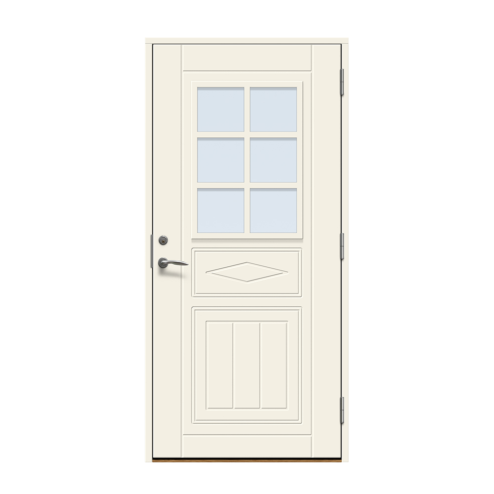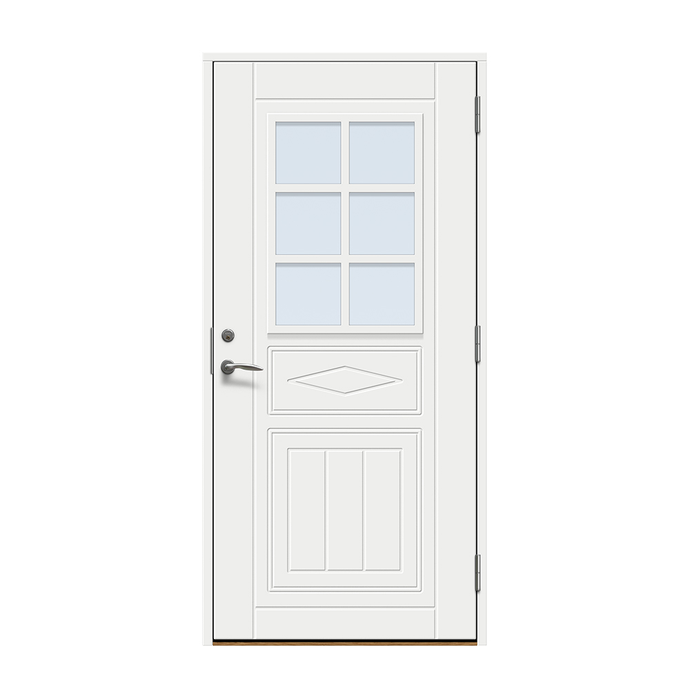 Svanshall är en entrédörr med ett klassiskt fönster som har fasta spröjs. Klassiskt dekor på utsidan och en slät insida.