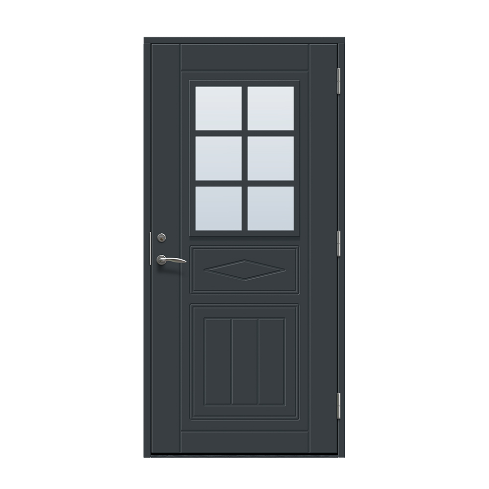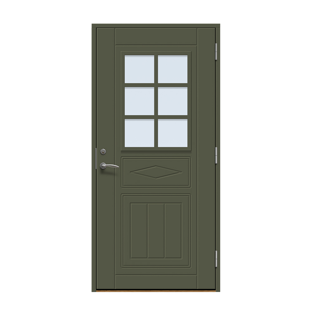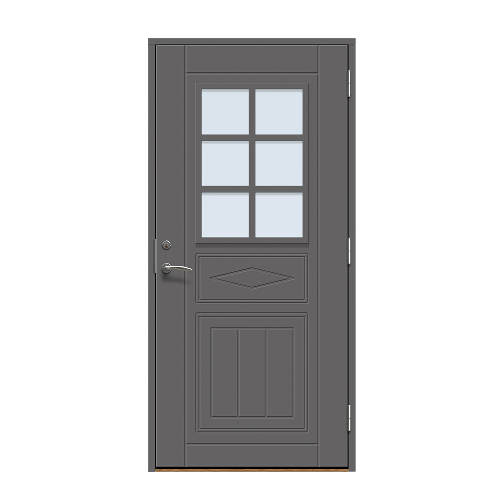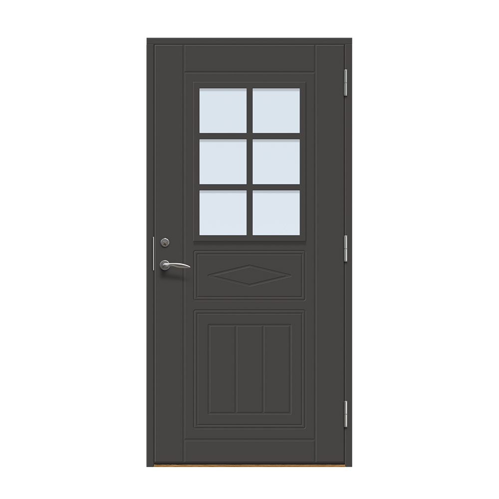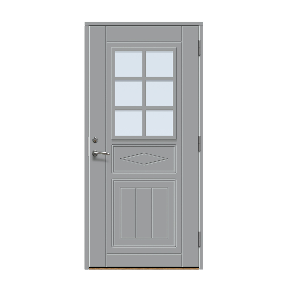Svanshall är en entrédörr med ett klassiskt fönster som har fasta spröjs. Klassiskt dekor på utsidan och en slät insida.