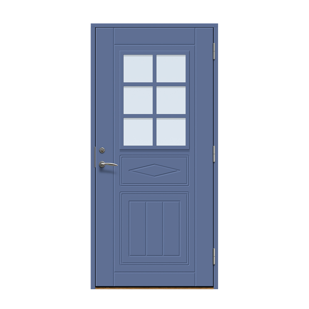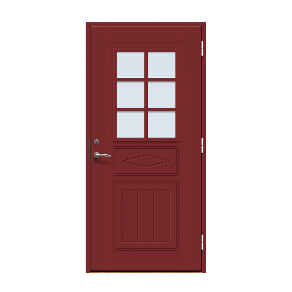 Dörren är täckt av en tålig faner. Behandlingen som appliceras på dörrens träfibrer gör att dörren tål extrema mängder vatten med minimal rörelse och svullnad. Dörren blir mycket tålig och färgen fäster bättre vilket ger längre underhållsintervall. Om dörren har fönster kommer glaset vara laminerat för extra styrka.