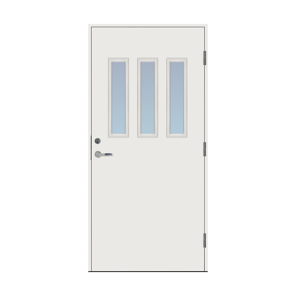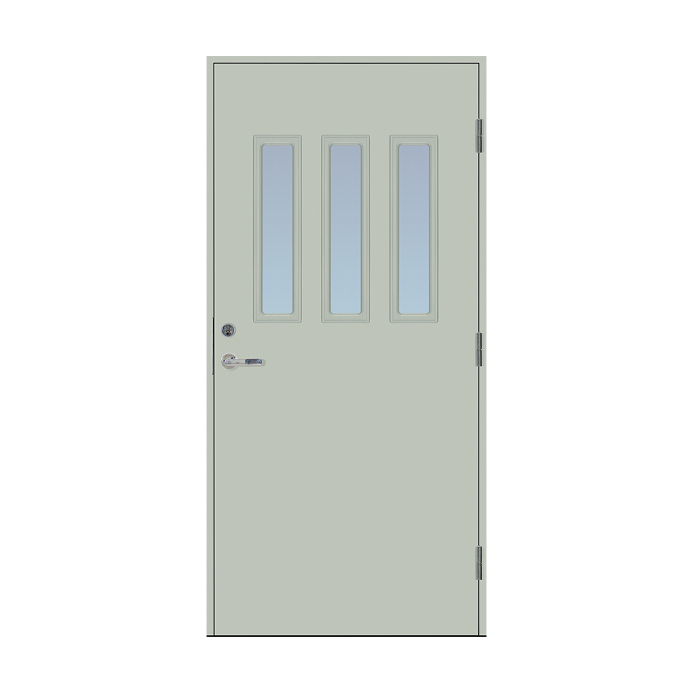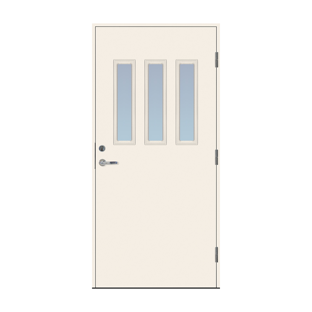 Dörrbladet har en slät insida, är 64 mm tjock och har 55 mm isolering samt två aluminiumplåtar som skyddar den inre konstruktionen.