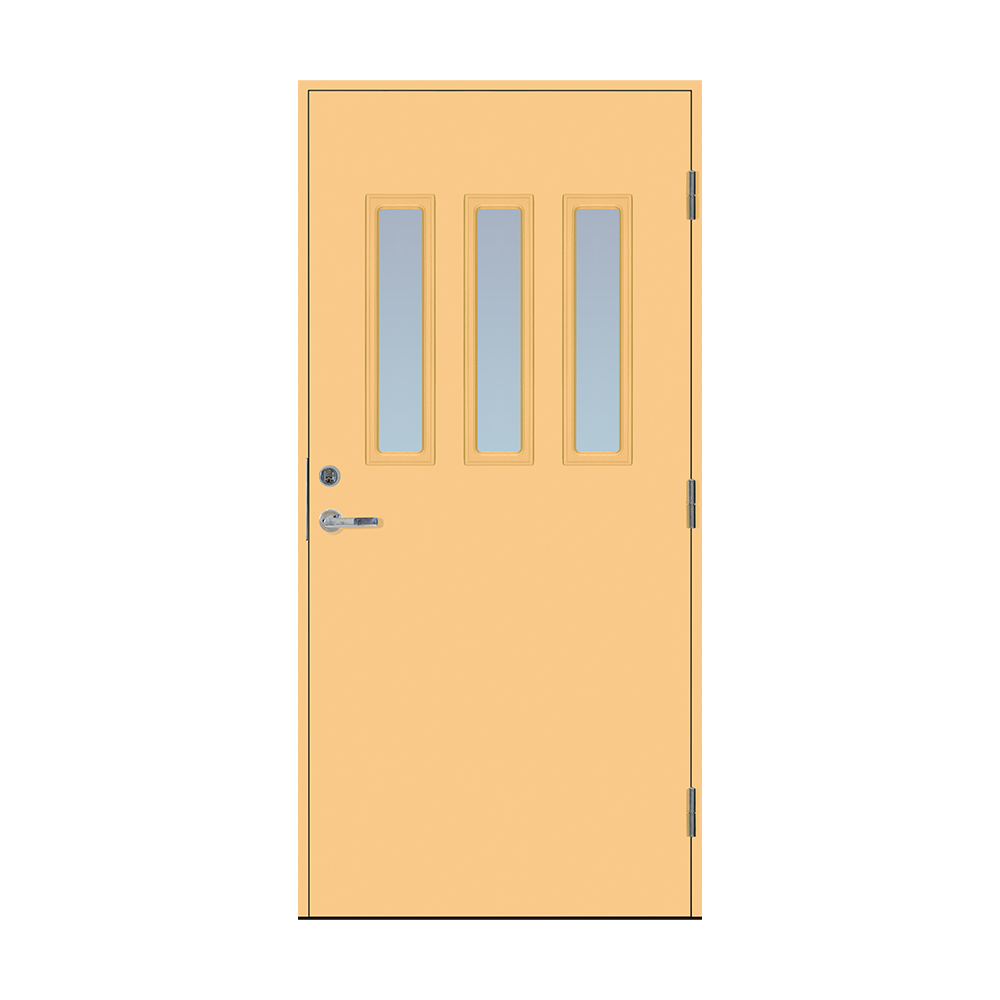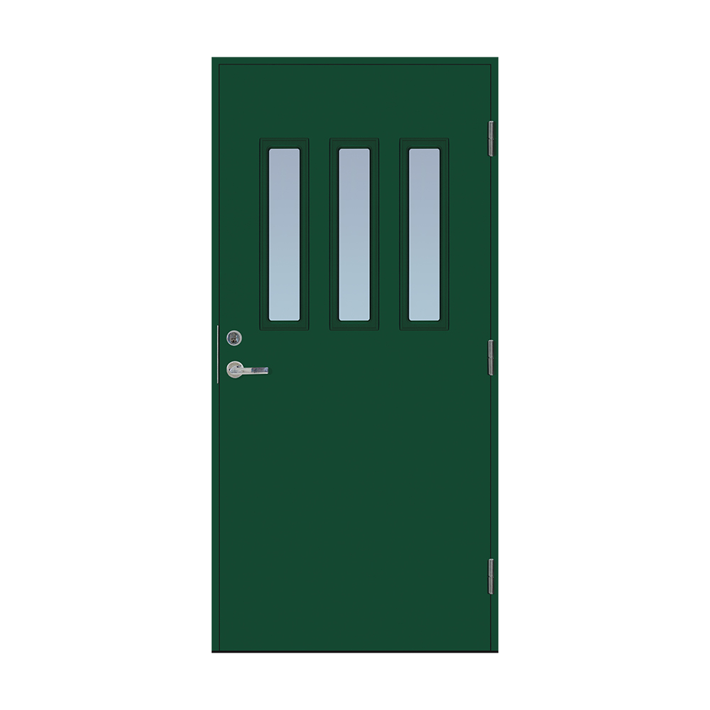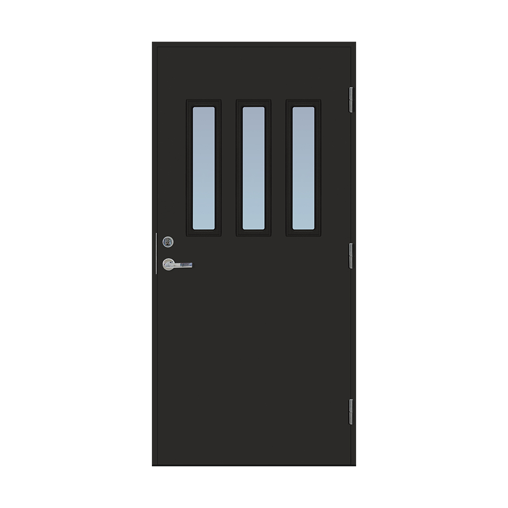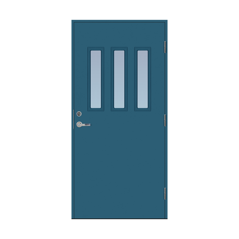 Dörrbladet har en slät insida, är 64 mm tjock och har 55 mm isolering samt två aluminiumplåtar som skyddar den inre konstruktionen.