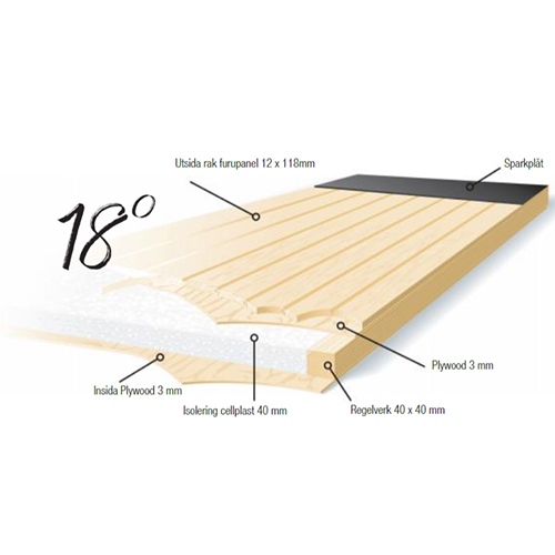 Dörren är isolerad, 105 mm karm och har en rak furupanel med svart sparkplåt nertill. 2-glas isolerruta på 42 x 56 cm. Förrådsdörren är 18 grader.