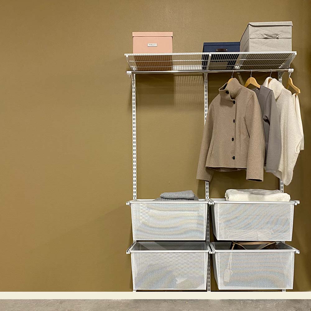 Även om denna lösningen är komplett för att passa bakom dina skjutdörrspartier så passar våra inredningspaket även lika bra i andra delar av hemmet. Skapa ordning även i hallen, kontoret eller förrådet med detta mångsidiga förvaringssystem.