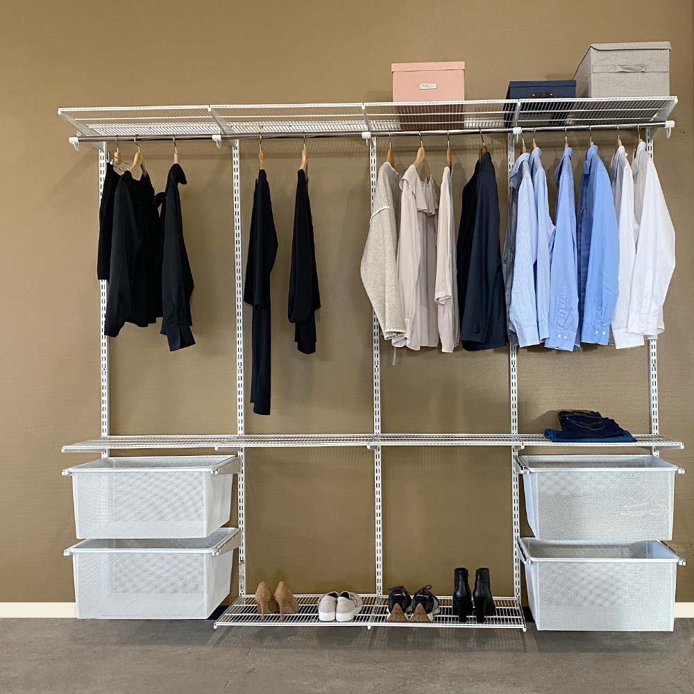 Även om denna lösning är anpassad för förvaring bakom skjutdörrspartier passar inredningspaketet lika bra i andra delar av hemmet. Skapa ordning i exempelvis sovrum, kontor eller förråd med detta mångsidiga förvaringssystem.