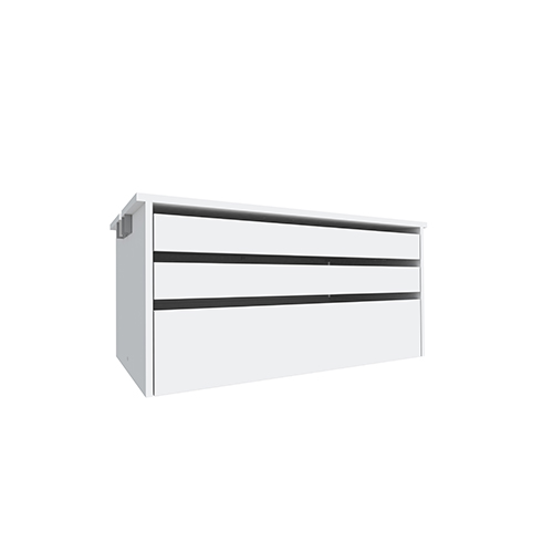 Hyllplanen är av 19 mm vit melaminbelagd MDF. Lådsidor samt lådfronter är av 16 mm vit melaminbelagd spånskiva. Låda med glasfront är av härdat glas. Till Hög låda tillkommer lådindelare, 1 st för bredd 640 och 790 mm och 2 st för bredd 940 och 1090 mm.