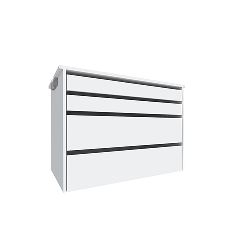 Hyllplanen är av 19 mm vit melaminbelagd MDF. Lådsidor samt lådfronter är av 16 mm vit melaminbelagd spånskiva. Låda med glasfront är av härdat glas. Till Hög låda tillkommer lådindelare, 1 st för bredd 640 och 790 mm och 2 st för bredd 940 och 1090 mm.