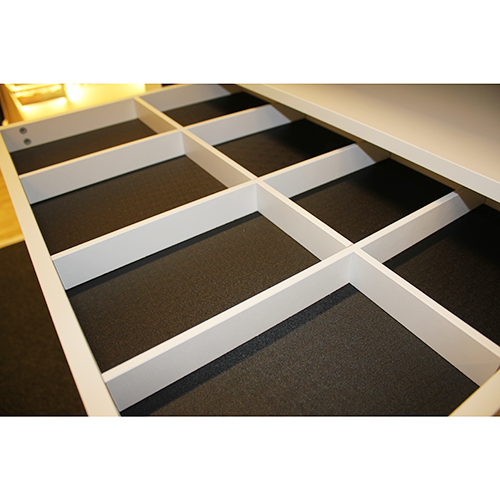 Inredning Mix Komplett innehåller följande: 1 st Lådsektion innehållande 3 st Mellanlådor 1 st Lådsektion innehållande 2 st Låga lådor och 1 st Mellanlåda glasfront 1 st Lådsektion innehållande 1 st Mellanlåda och 1 st Hög låda 1 st Lådindelare till Låg låda 1 st Lådindelare till Mellanlåda 1 st Skoinredning till Mellanlåda 2 st Lådmattor, svarta 1 st Klädstång 1 st flyttbart Hyllplan LED Belysning