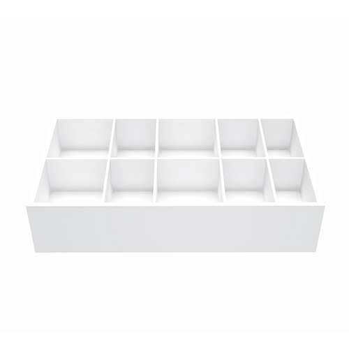 Hyllplanen är av 19 mm vit melaminbelagd spånskiva. Lådsidor, lådfronter och högskåp är av 16 mm vit melaminbelagd spånskiva. Låda med glasad lådfront är av härdat glas. Lådorna är utrustade med mjukstängare.