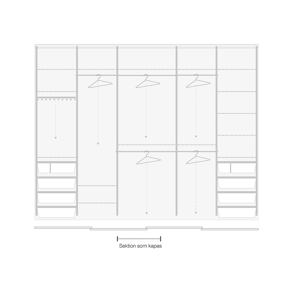 Inredningspaket sovrum + linne 2500 - 3000 mm är ett baspaket som enkelt går att komplettera med tillbehör för en komplett nivå efter olika behov och rum. Det är alltid sektionen som är 815 mm som kapas för önskad bredd i breddintervallet.