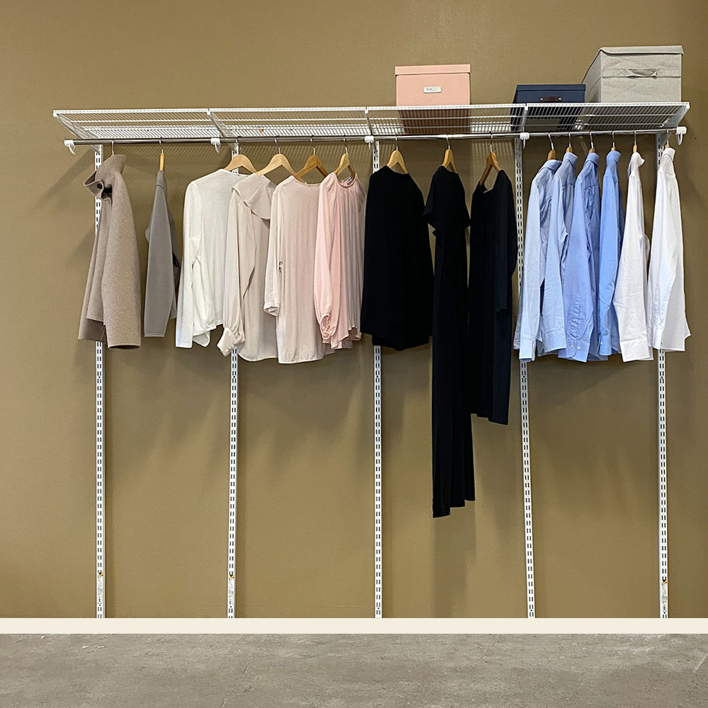 Även om denna lösningen är komplett för att passa bakom dina skjutdörrspartier så passar våra inredningspaket även lika bra i andra delar av hemmet. Skapa ordning även i hallen, kontoret eller förrådet med detta mångsidiga förvaringssystem.