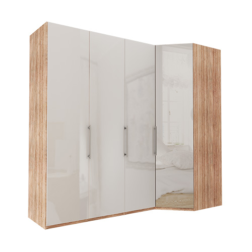 Dörren / dörrarna på hörn och walk-in är alltid spegel i bronstonat glas. Övriga garderobsdörrar är i vitt glas.
