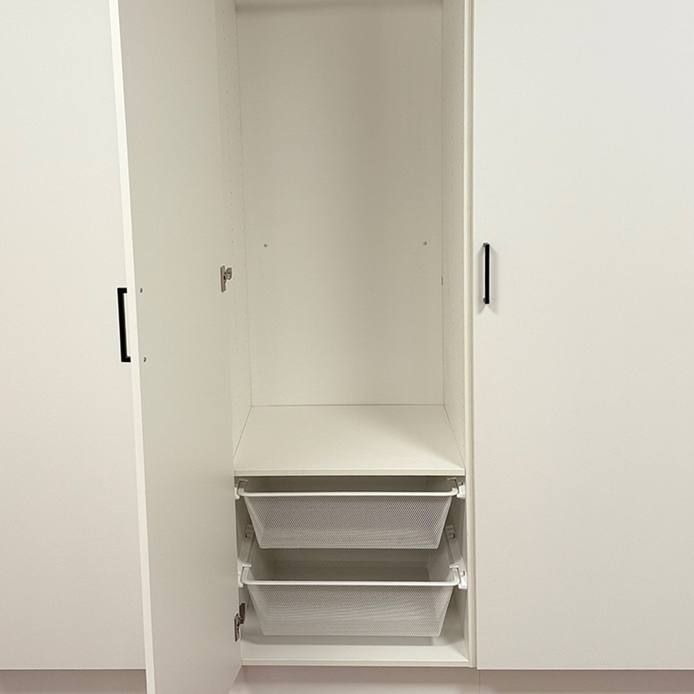 Tillverkat av 16 mm melaminbelagd spånskiva i vitt. Ytan är tålig, lätt att rengöra och håller sig fin länge. Klädstången ger plats för hängande plagg, meshkorgar skapar luftig förvaring för kläder och textilier och hyllplanet upptill är perfekt för lådor eller vikta plagg.