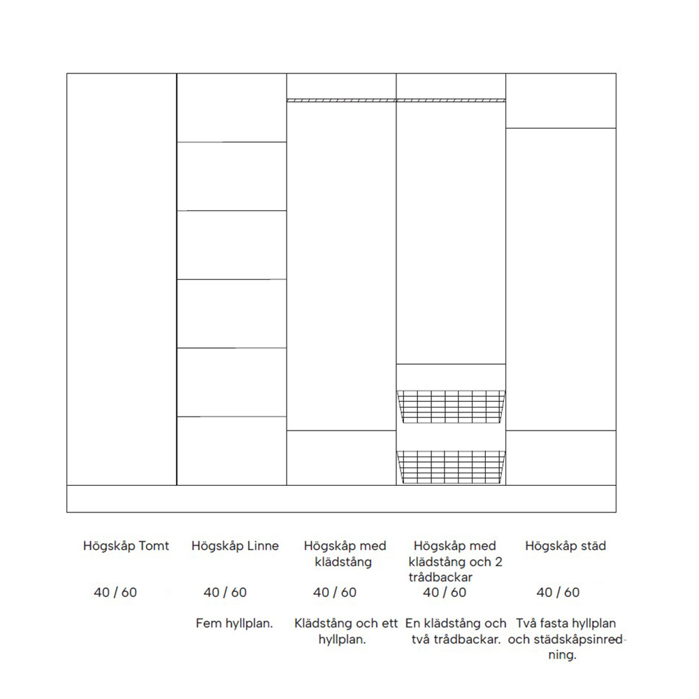 Finns i två höjder, 195 cm och 225 cm, samt i bredderna 40 och 60 cm. Välj den storlek som passar bäst för dina behov och ditt rum.